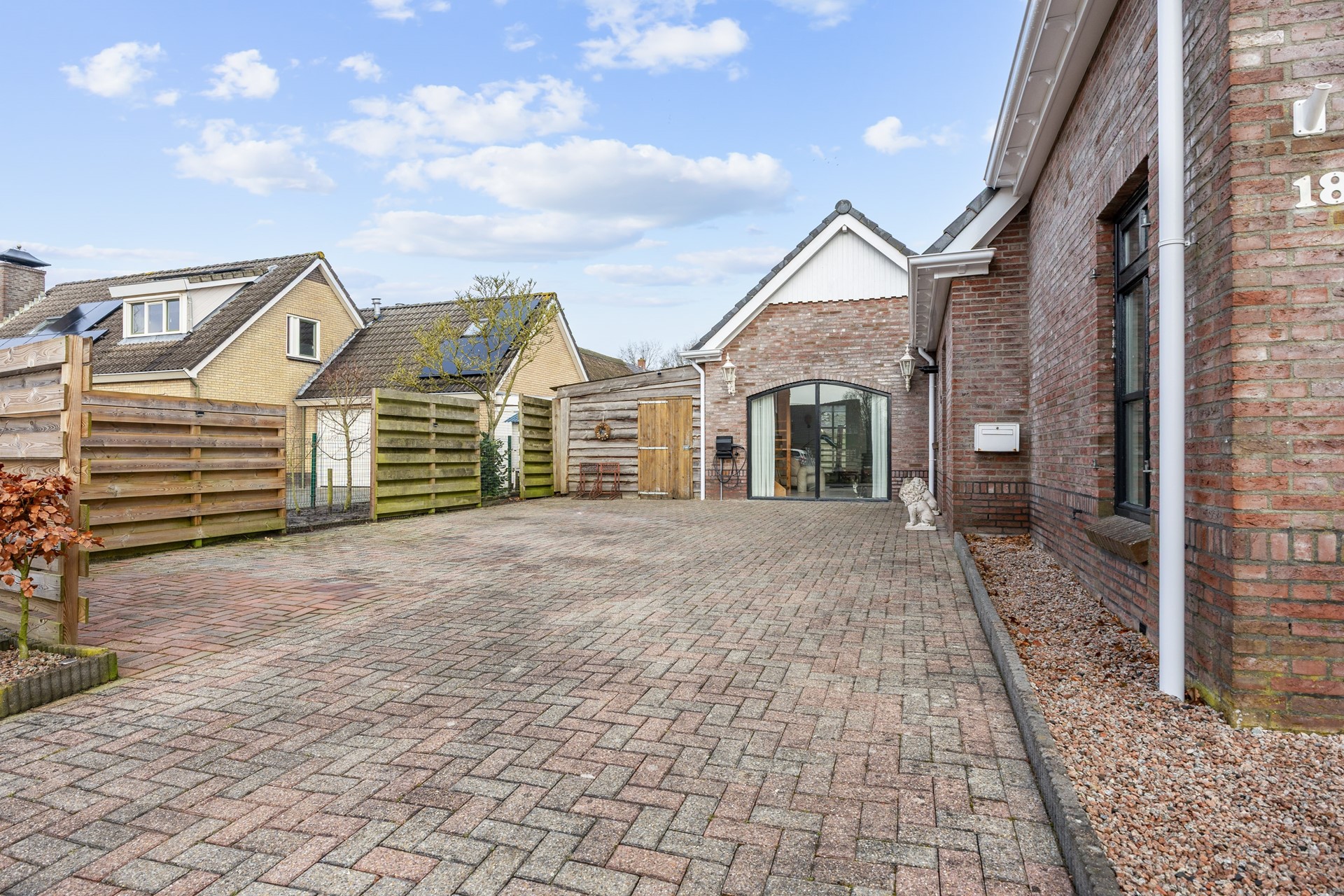 De royale oprit biedt ruimte voor het parkeren van meerdere auto’s. Een oplaadpunt voor een elektrische auto is aanwezig.