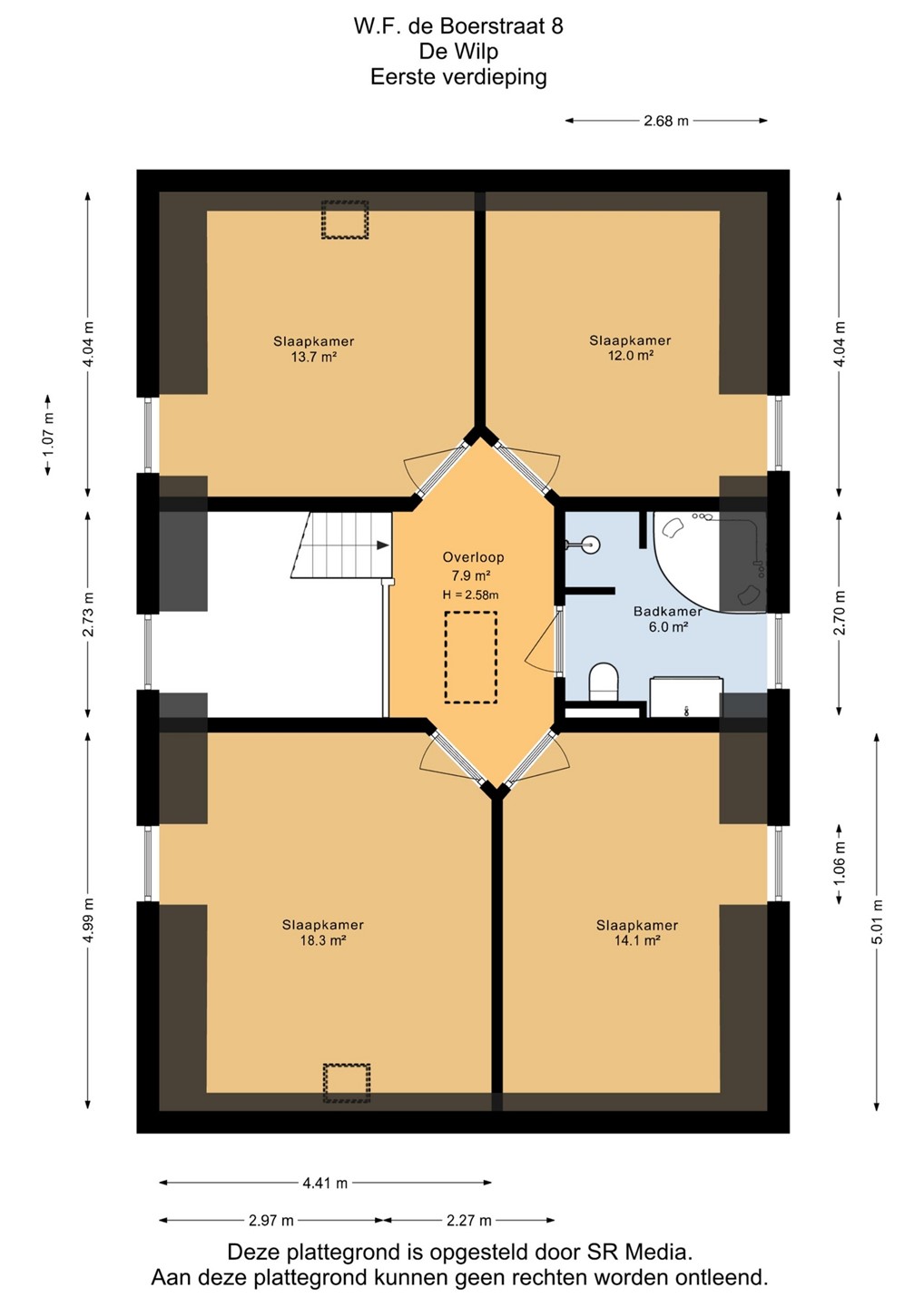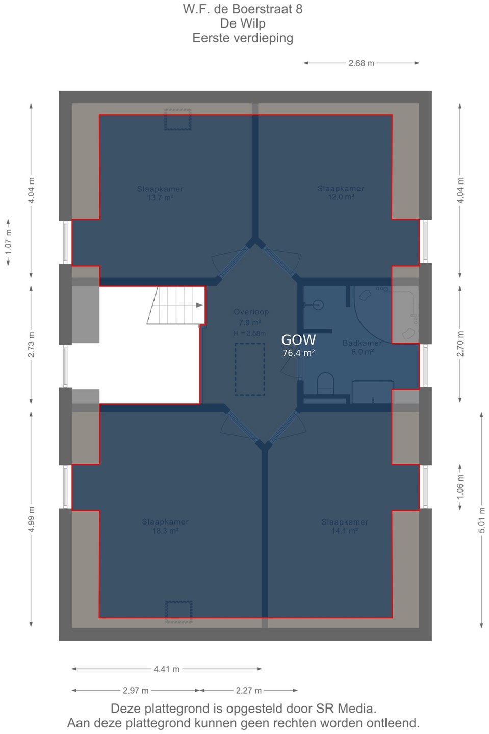 Op de eerste verdieping zijn vier comfortabele slaapkamers gelegen. De tweede, luxe badkamer op deze verdieping beschikt over een inloopdouche, toilet, wastafel en een heerlijk bubbelbad. Via een vlizotrap bereikt u een grote zolder met stahoogte, ideaal als extra opslagruime.