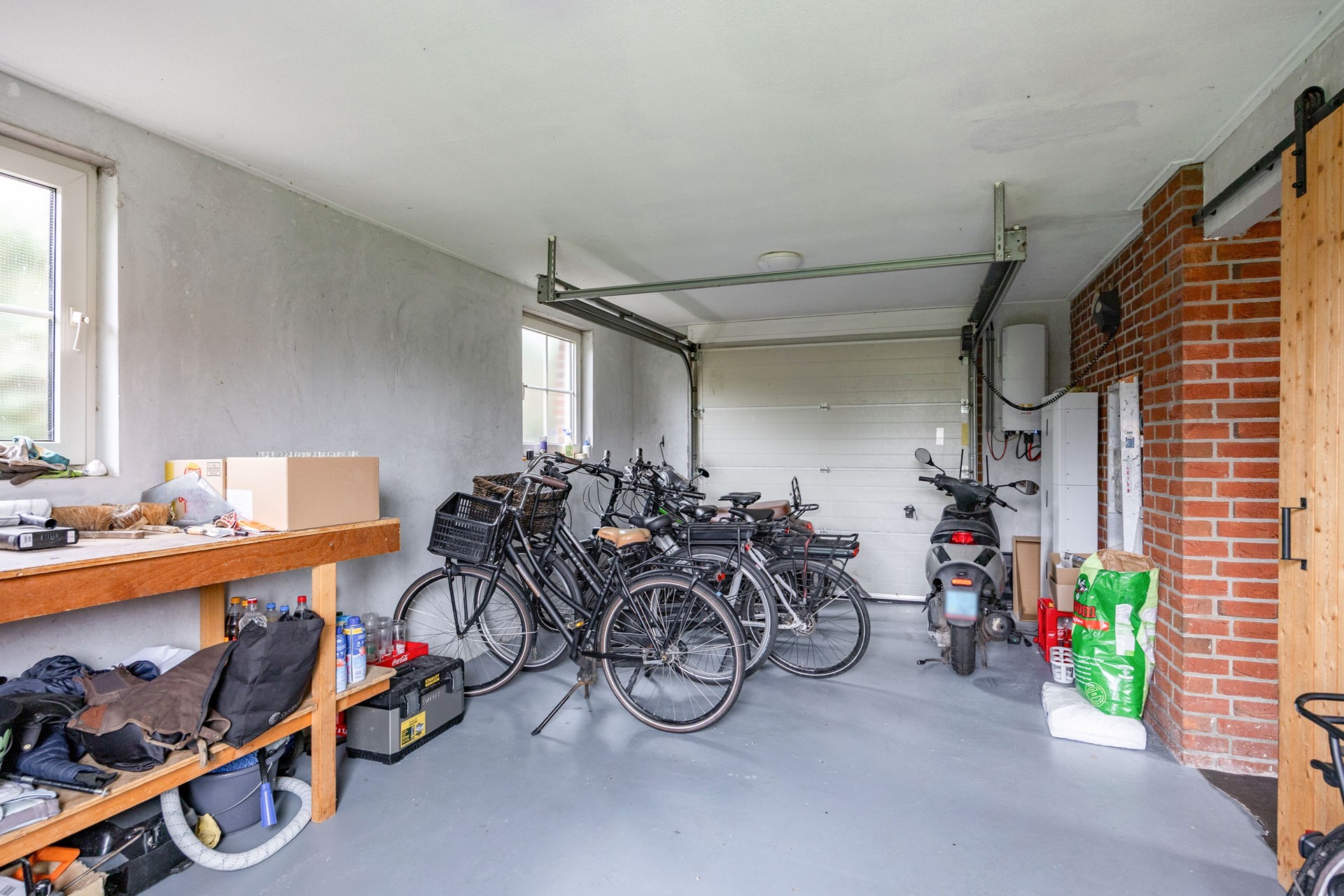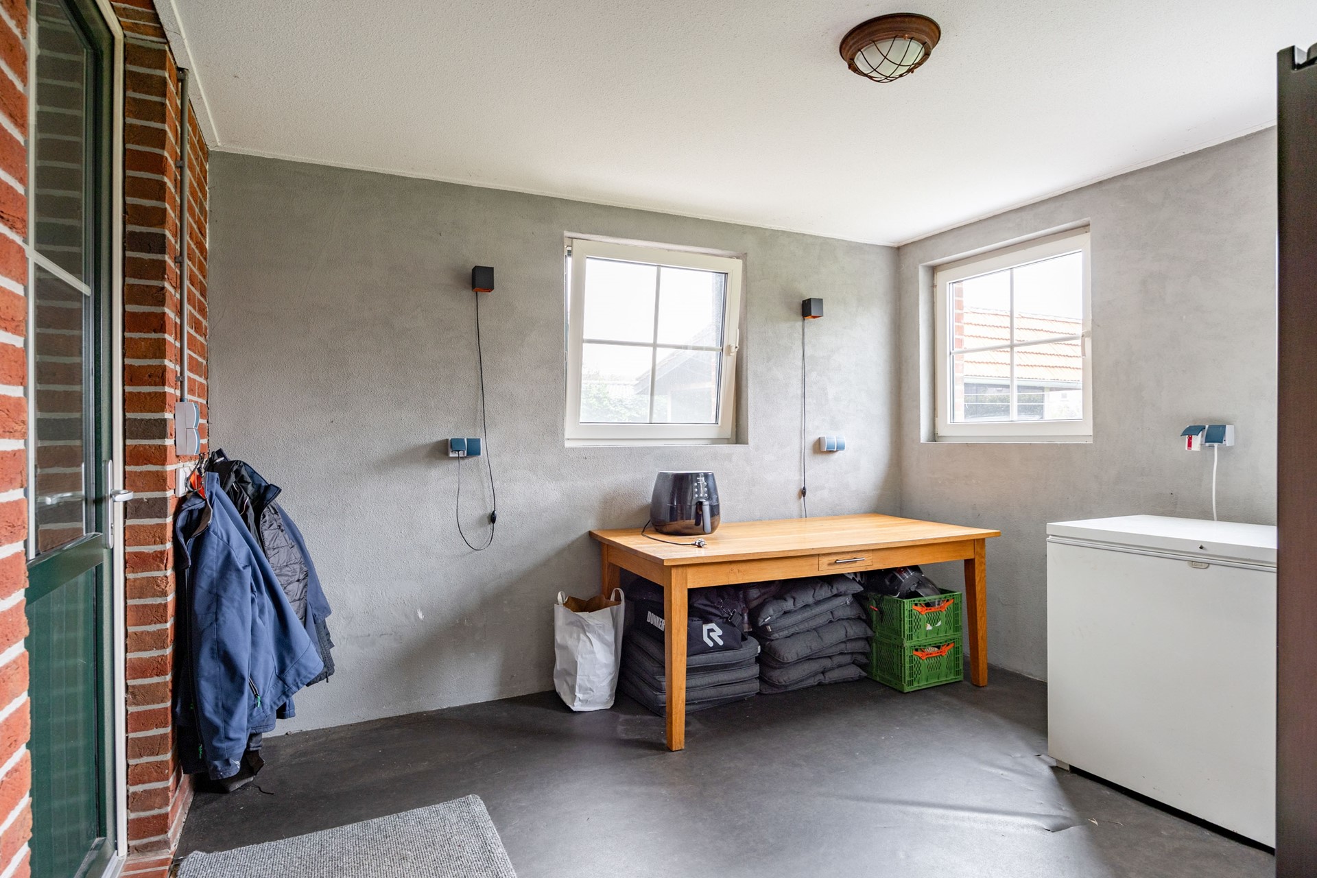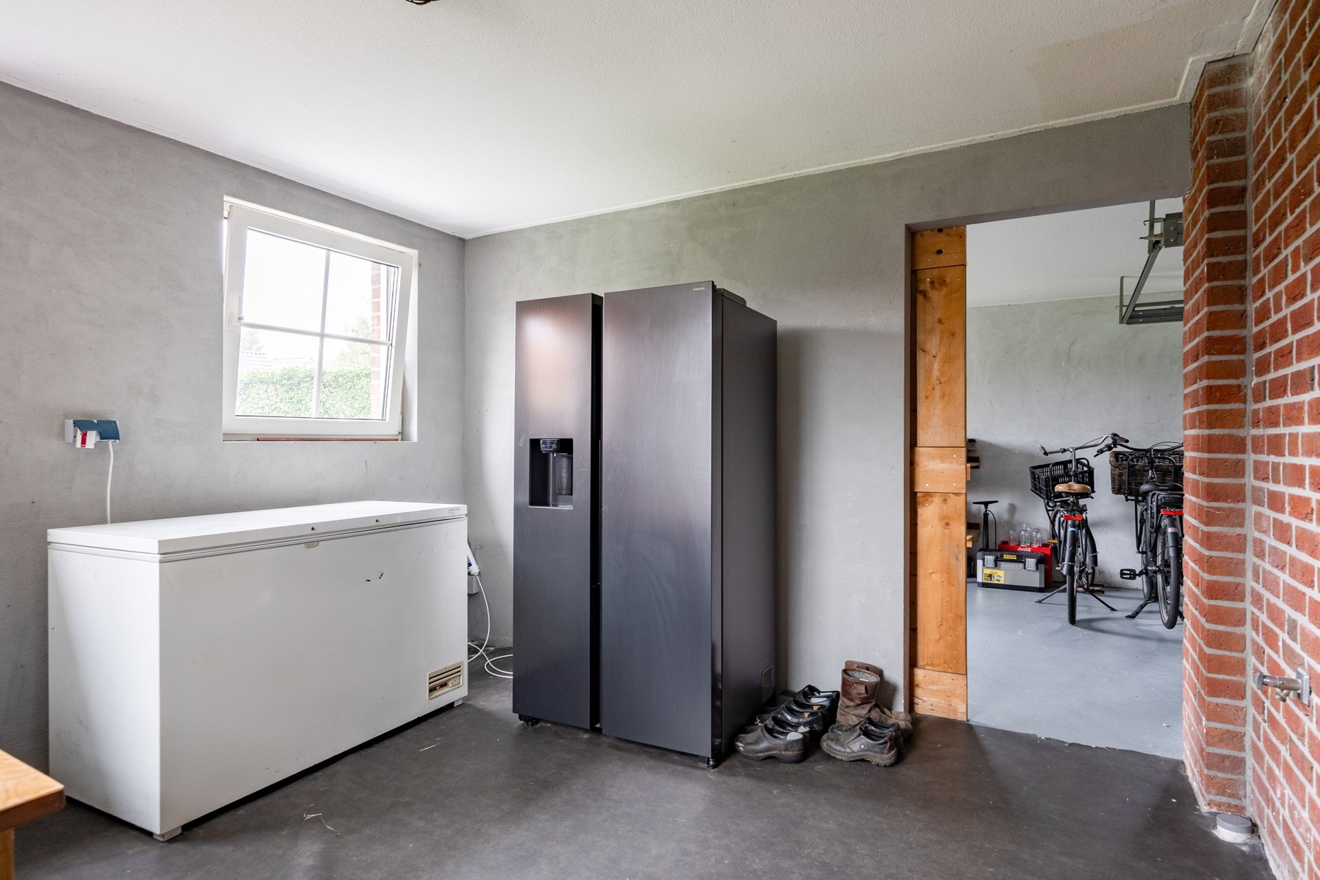 Aansluitend aan de keuken bevindt zich een ruime bijkeuken met spoelbak, witgoedaansluiting en de warmtepompunit uit 2025. Vanuit hier loopt u door naar een praktische berging en vervolgens naar de aangebouwde garage, die eveneens toegang biedt tot de achtertuin. Alles is gericht op gebruiksgemak, comfort en een luxe woonbeleving.