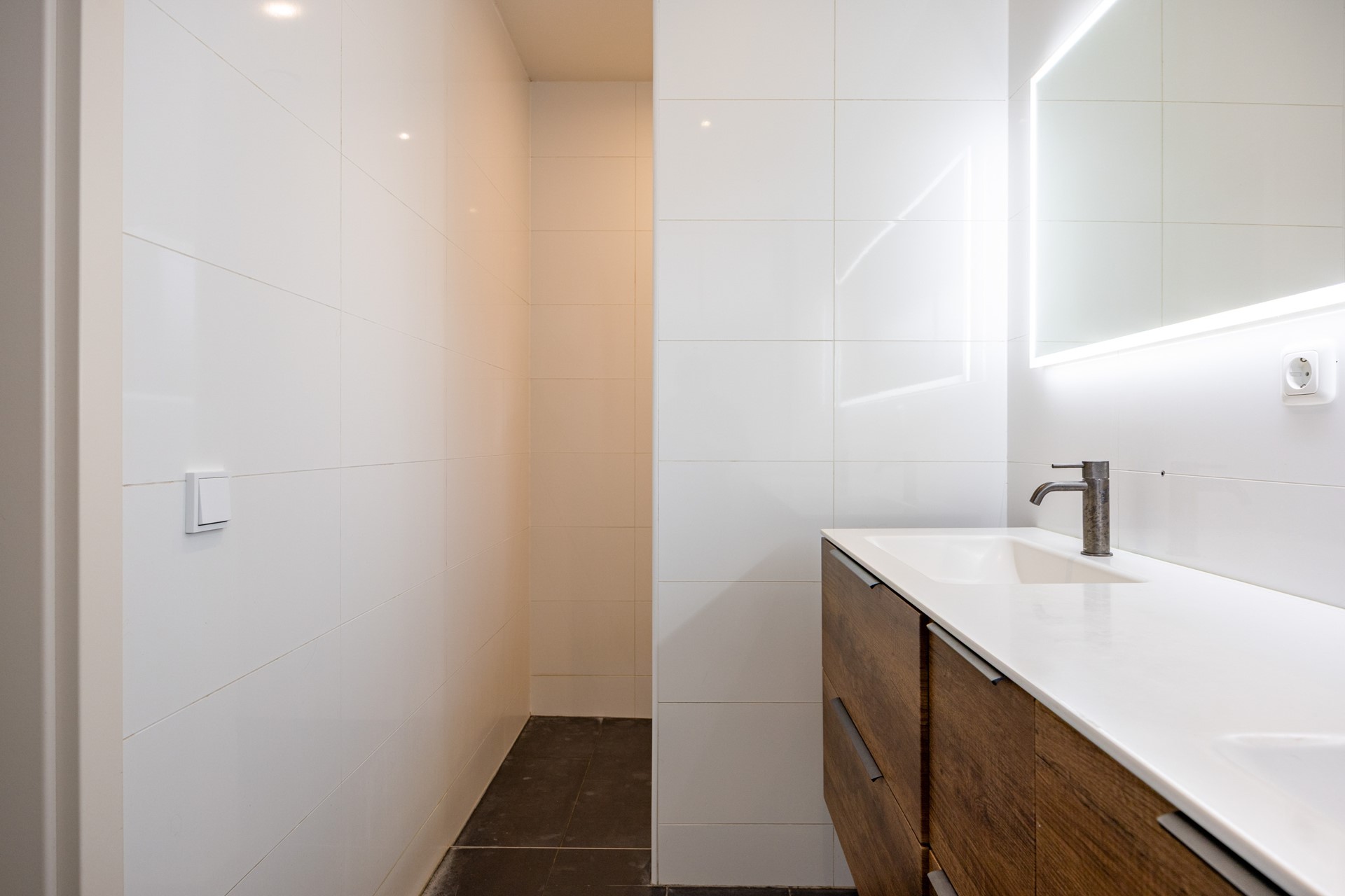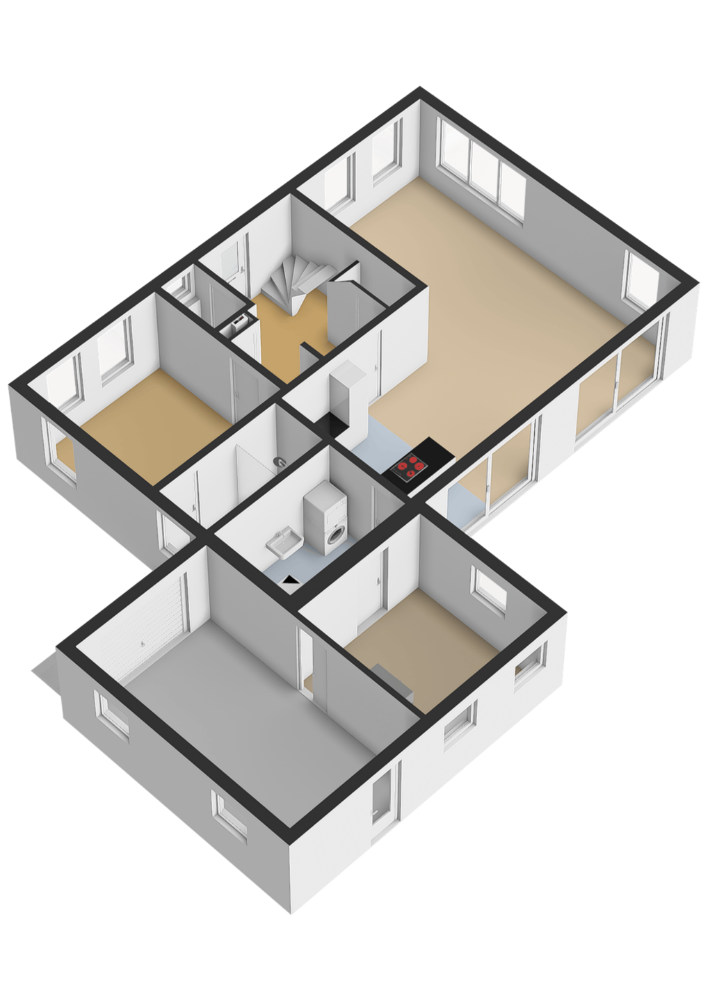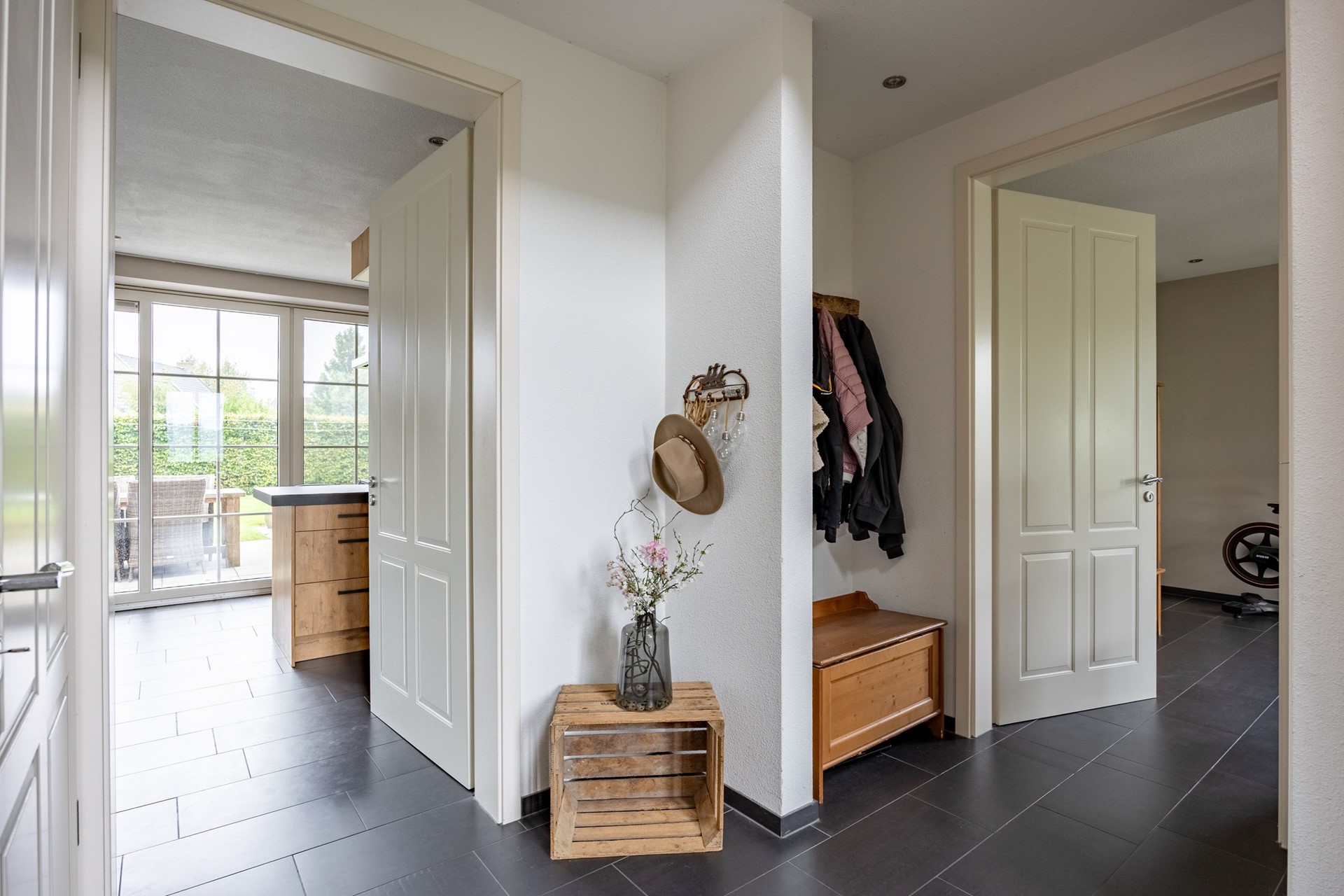 Aansluitend aan de keuken bevindt zich een ruime bijkeuken met spoelbak, witgoedaansluiting en de warmtepompunit uit 2025. Vanuit hier loopt u door naar een praktische berging en vervolgens naar de aangebouwde garage, die eveneens toegang biedt tot de achtertuin. Alles is gericht op gebruiksgemak, comfort en een luxe woonbeleving.