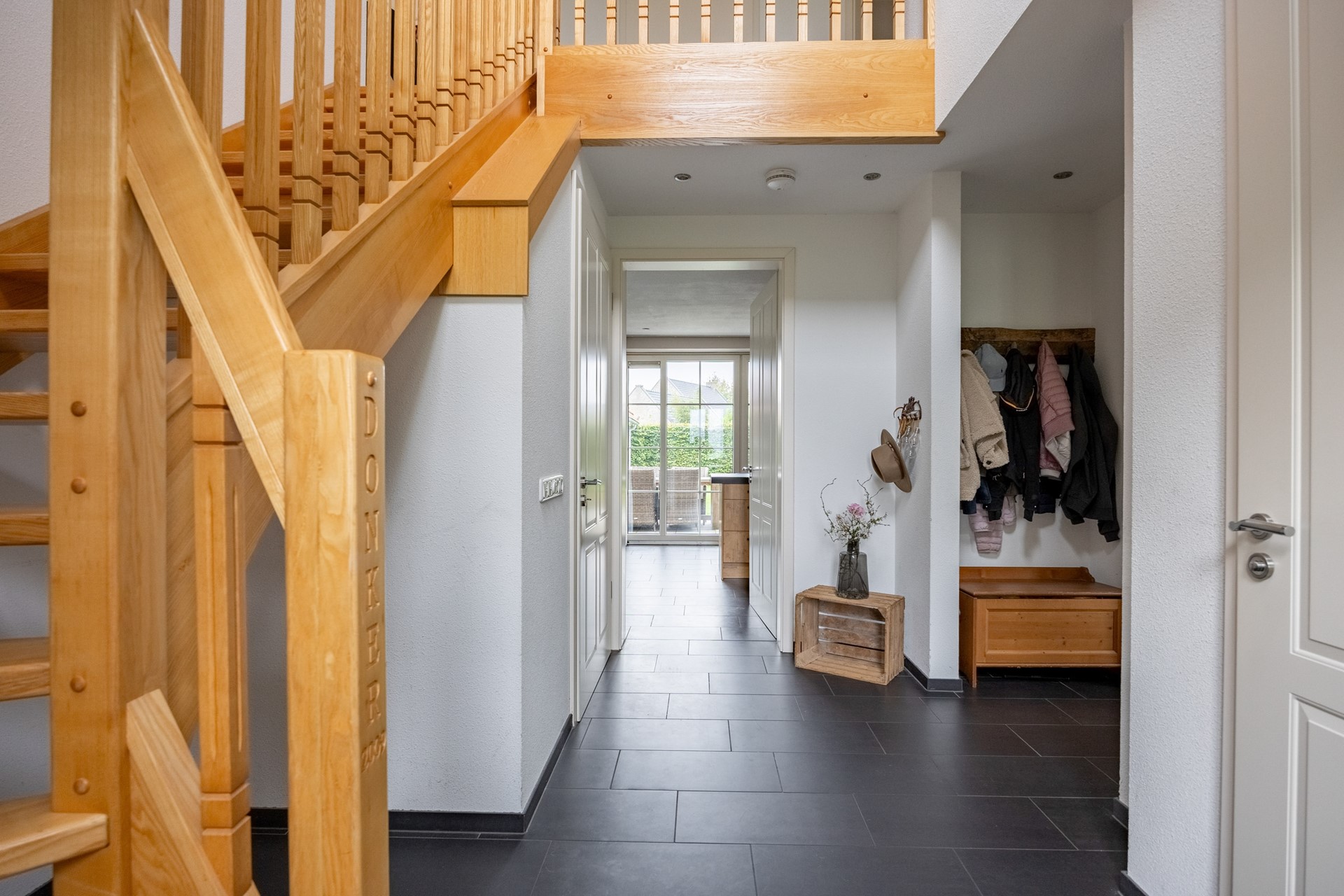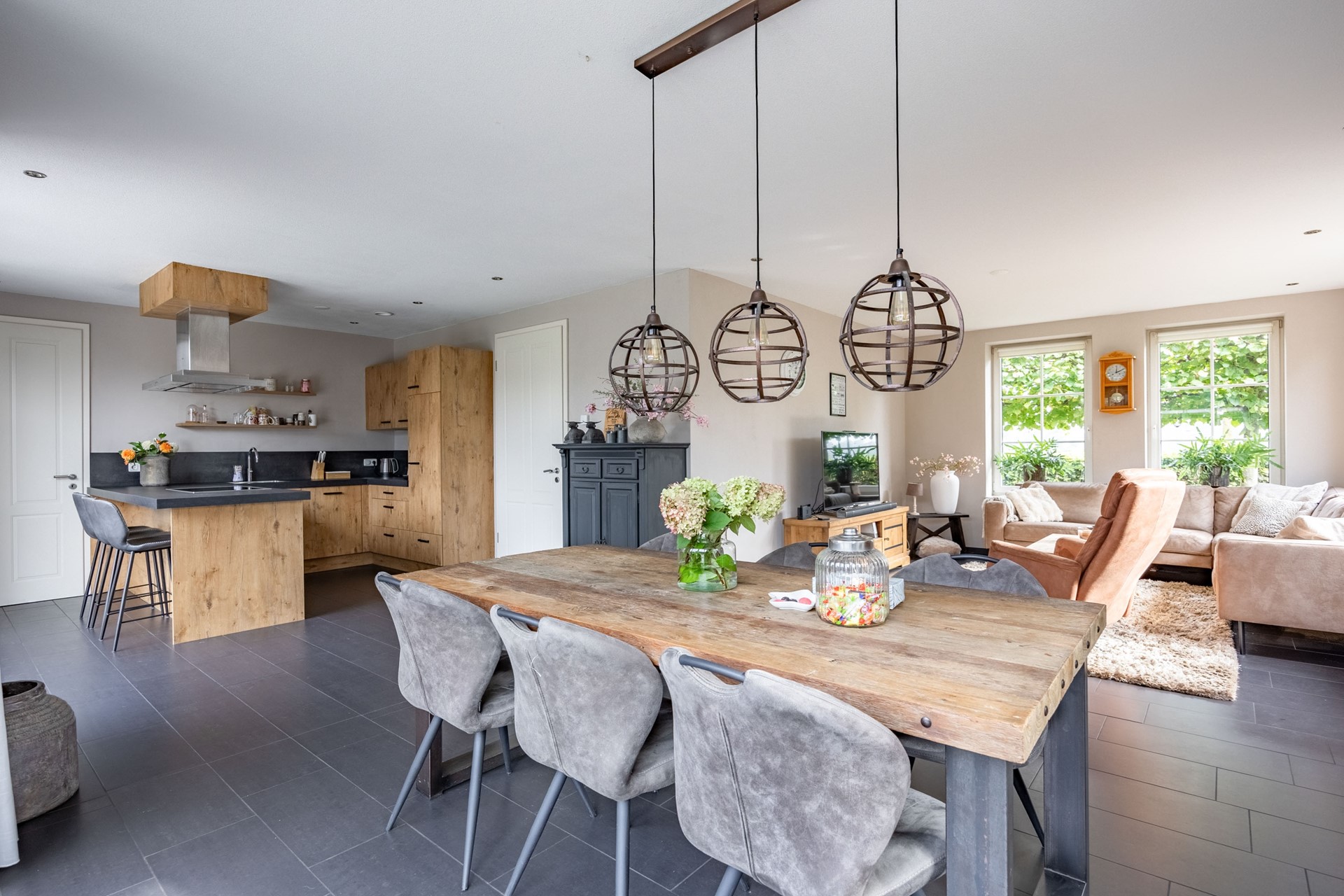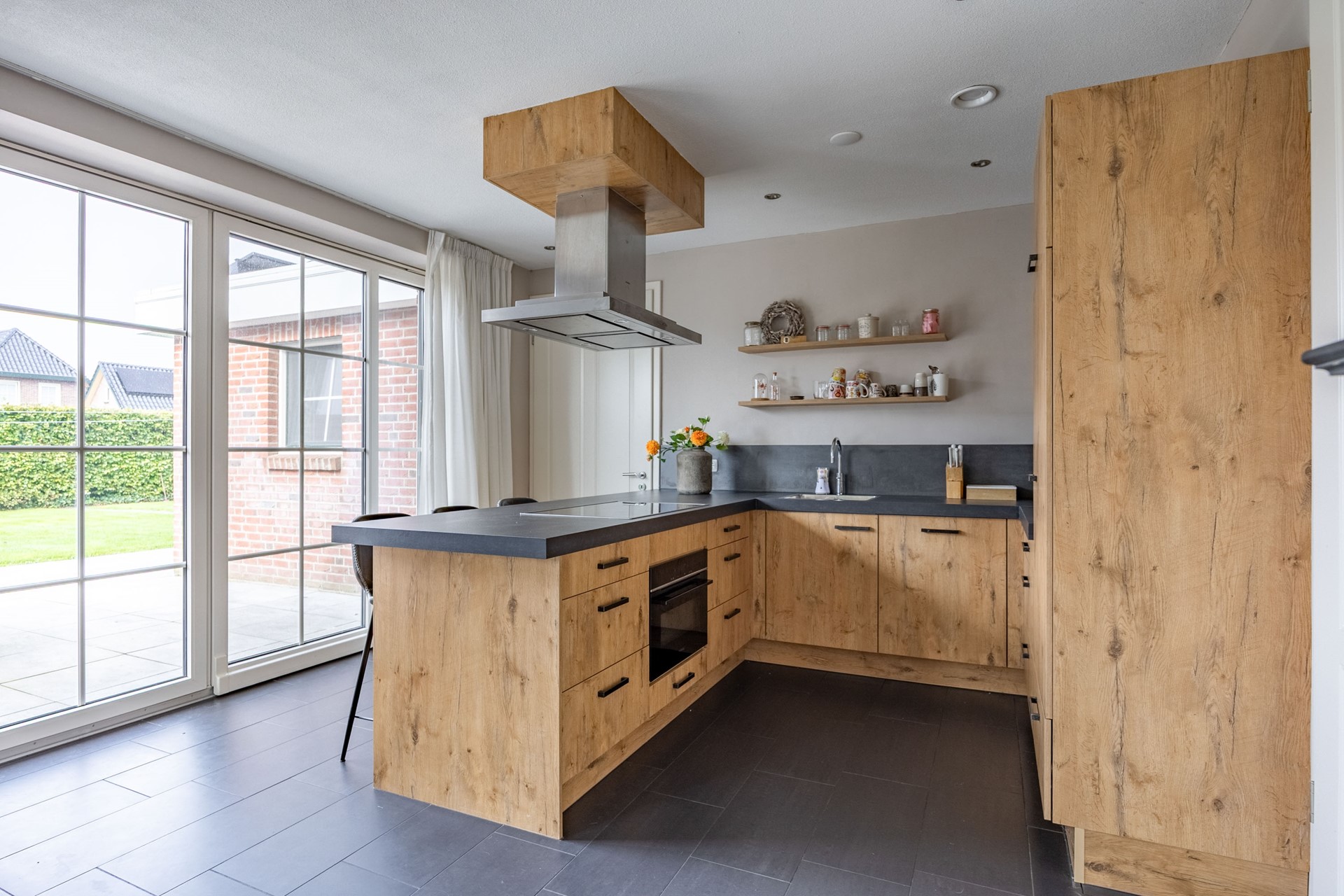 Bij binnenkomst via de voordeur komt u in de centrale hal waar zich het toilet, een voorraadkast, de meterkast en de royale trapopgang naar boven bevinden. Vanuit hier loopt u door naar de royale en lichte woonkamer. Dankzij de grote raampartijen en twee schuifpuien valt het daglicht rijkelijk naar binnen en is er een prachtig zicht op de tuin. De woonkamer staat in open verbinding met de sfeervolle keuken, die is voorzien van een moderne, circa drie jaar oude keukenopstelling met inductiekookplaat, koelkast, combi-oven, vaatwasser en een gezellig barretje waar u met gemakt aan kunt zitten.