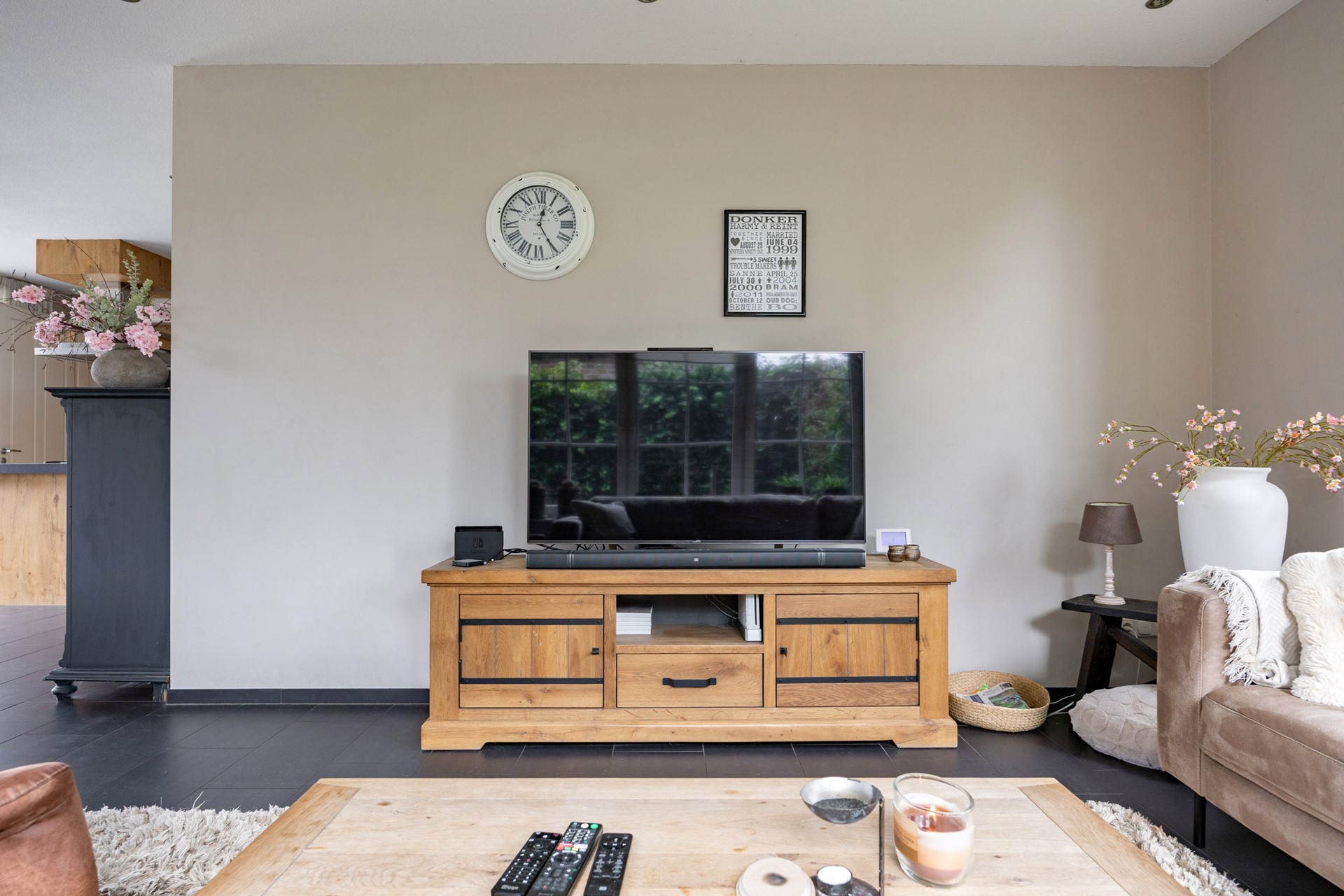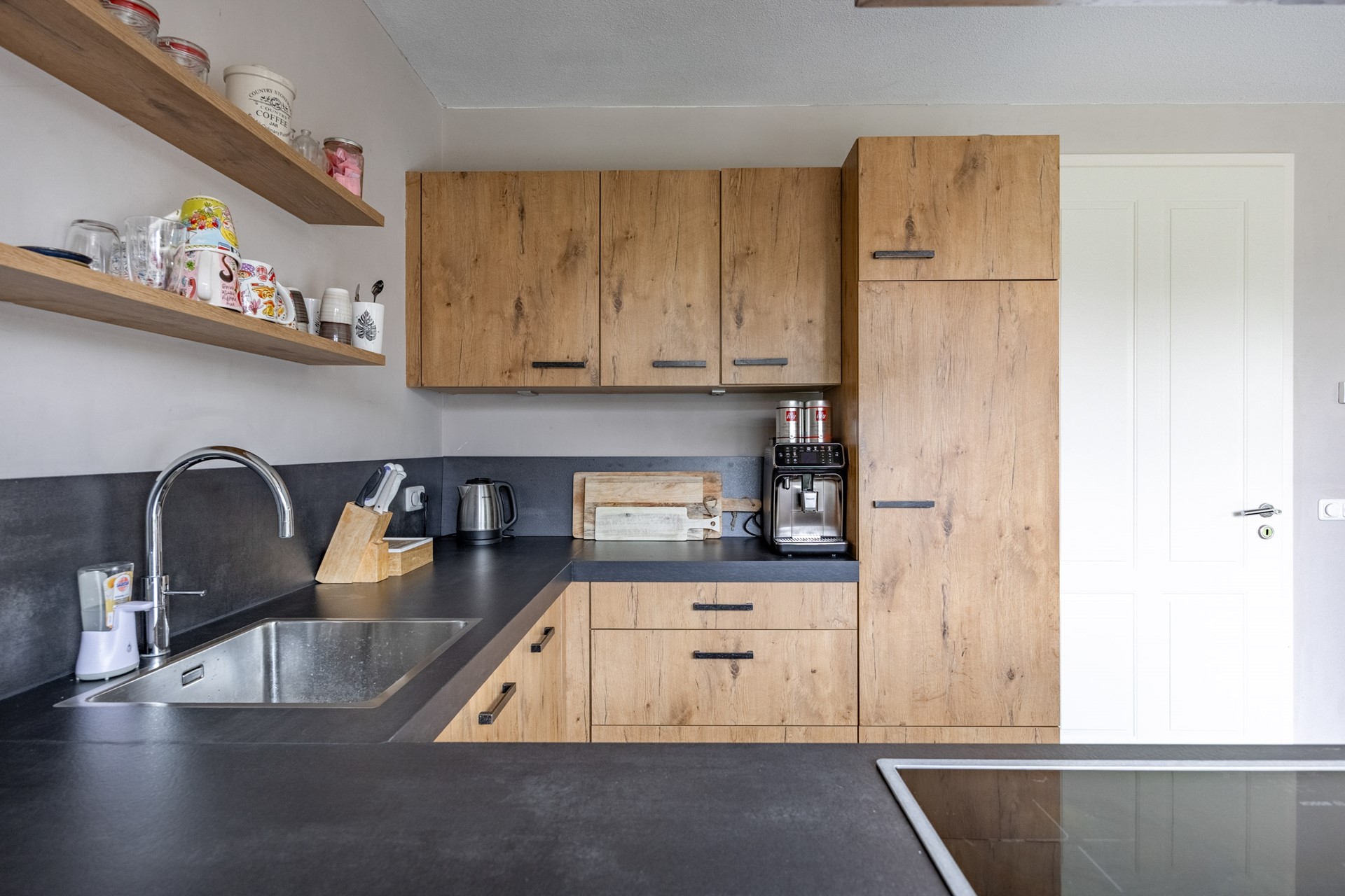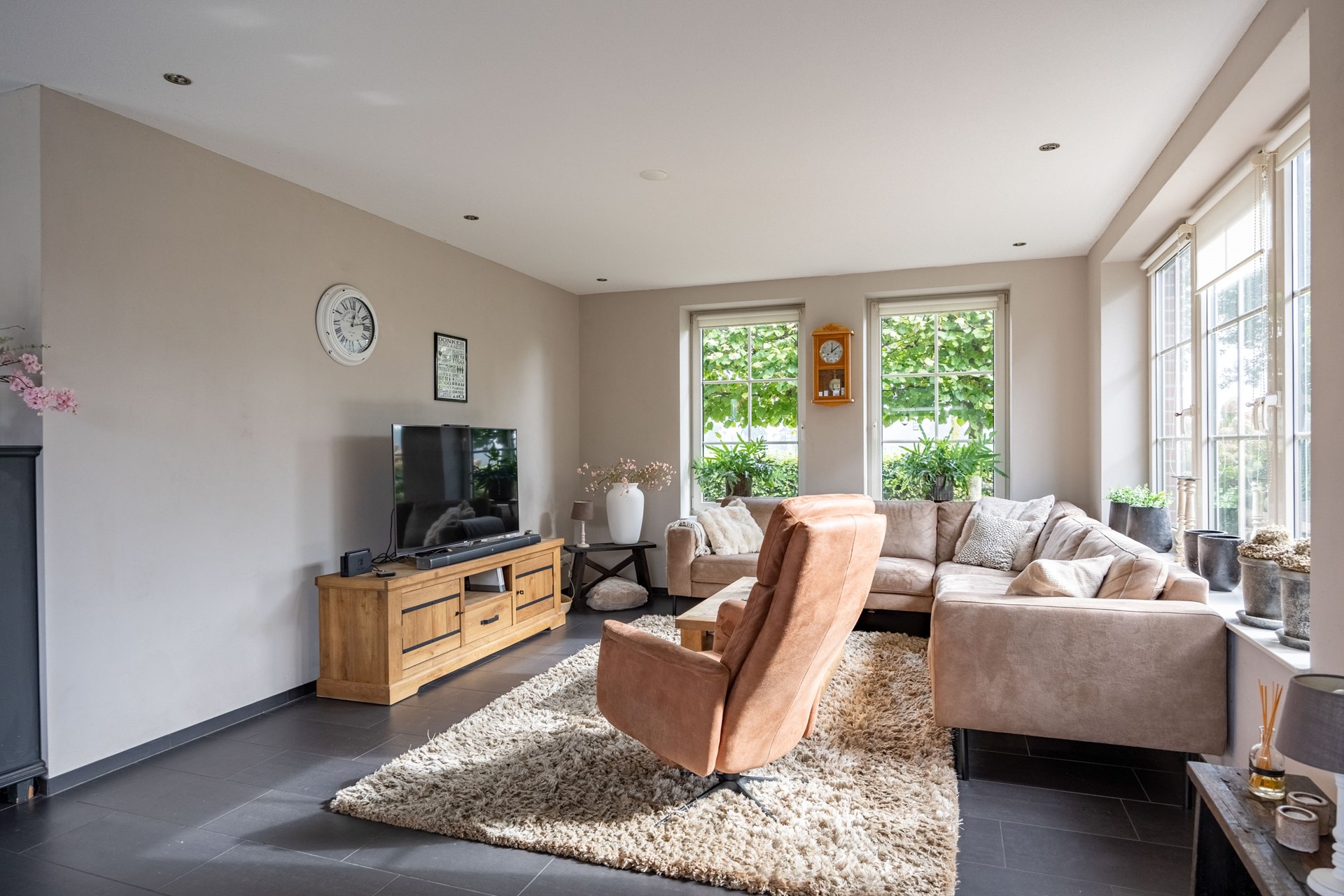 Bij binnenkomst via de voordeur komt u in de centrale hal waar zich het toilet, een voorraadkast, de meterkast en de royale trapopgang naar boven bevinden. Vanuit hier loopt u door naar de royale en lichte woonkamer. Dankzij de grote raampartijen en twee schuifpuien valt het daglicht rijkelijk naar binnen en is er een prachtig zicht op de tuin. De woonkamer staat in open verbinding met de sfeervolle keuken, die is voorzien van een moderne, circa drie jaar oude keukenopstelling met inductiekookplaat, koelkast, combi-oven, vaatwasser en een gezellig barretje waar u met gemakt aan kunt zitten.