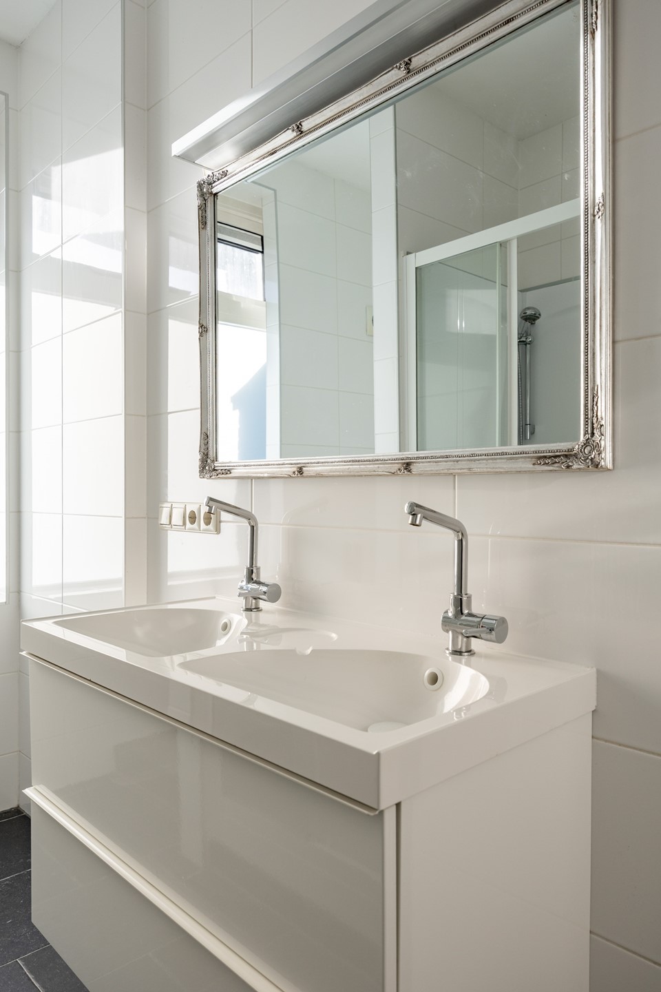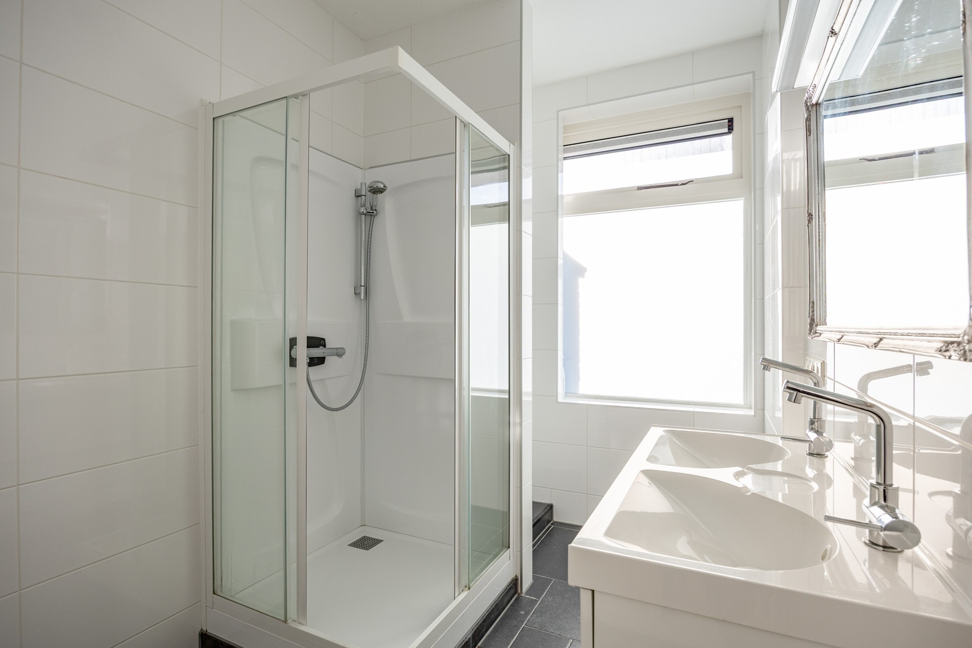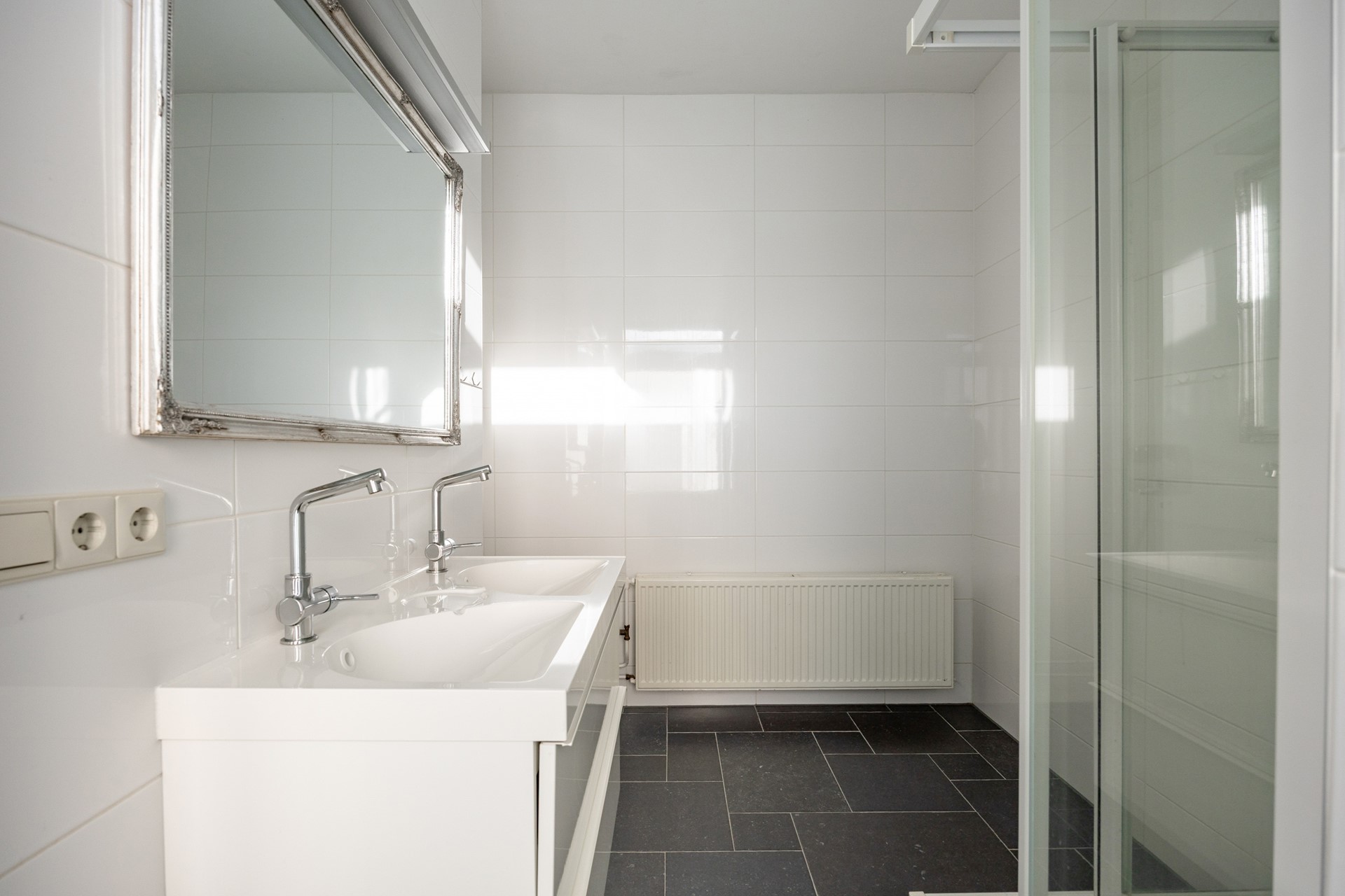 De riante badkamer is modern en van alle gemakken voorzien. In deze ruimte is ook plek voor de wasmachine en droger.