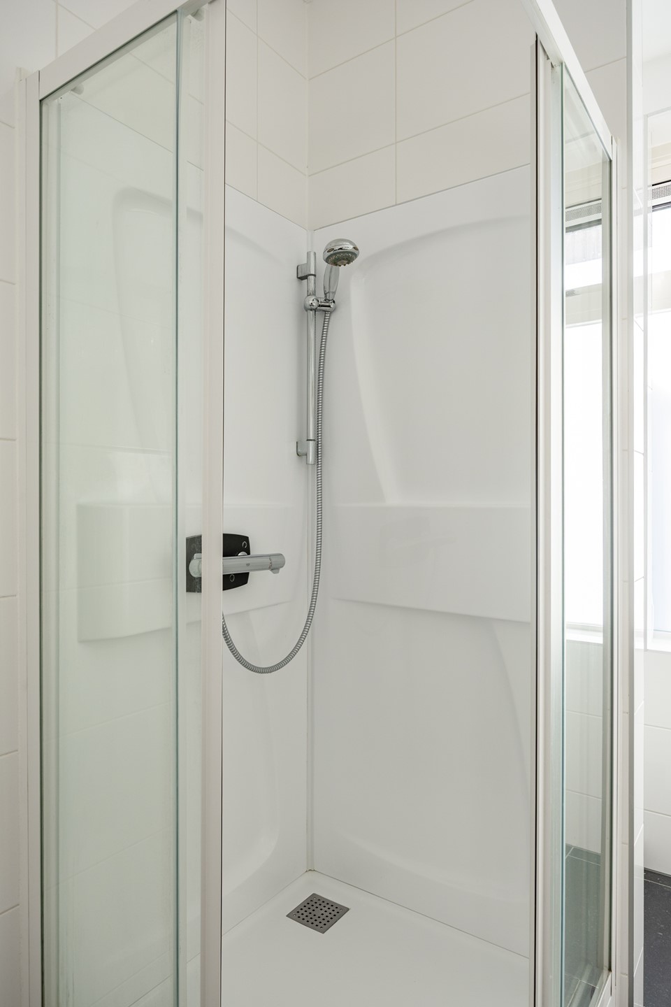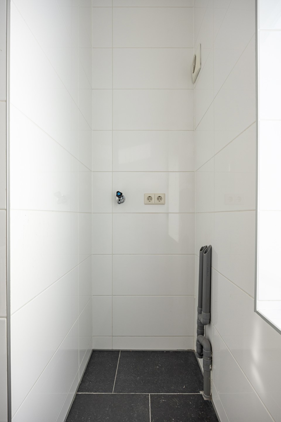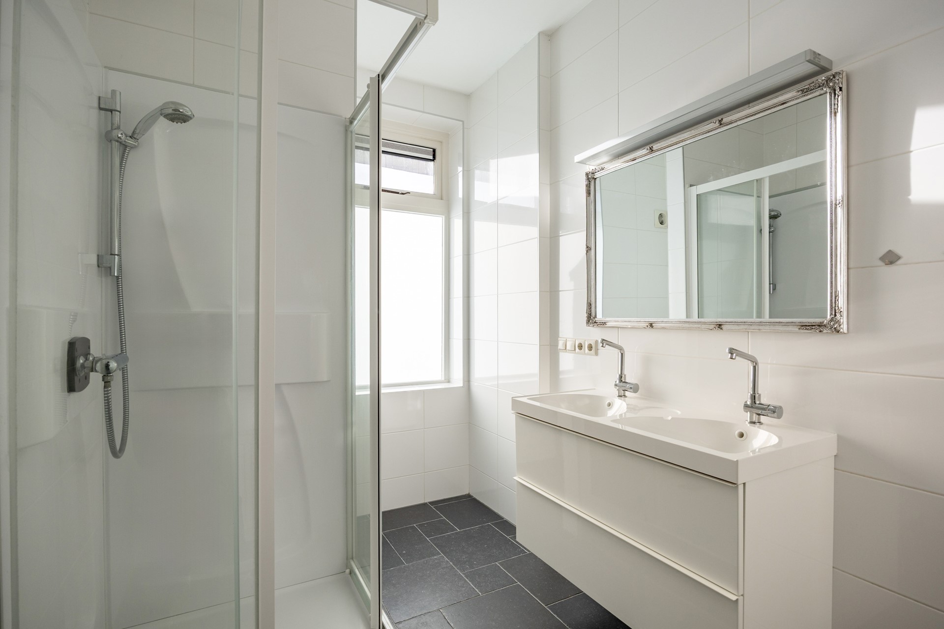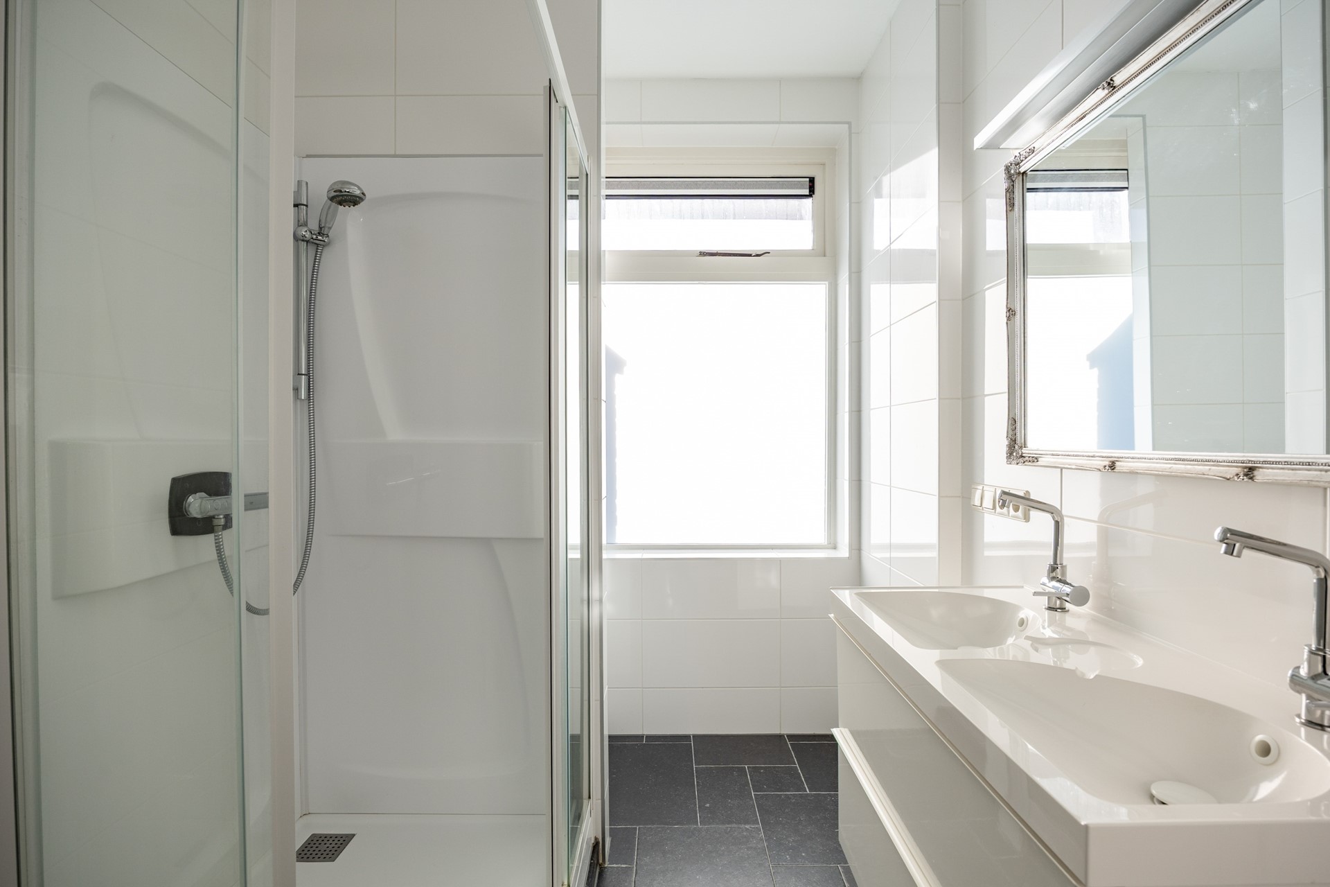De riante badkamer is modern en van alle gemakken voorzien. In deze ruimte is ook plek voor de wasmachine en droger.