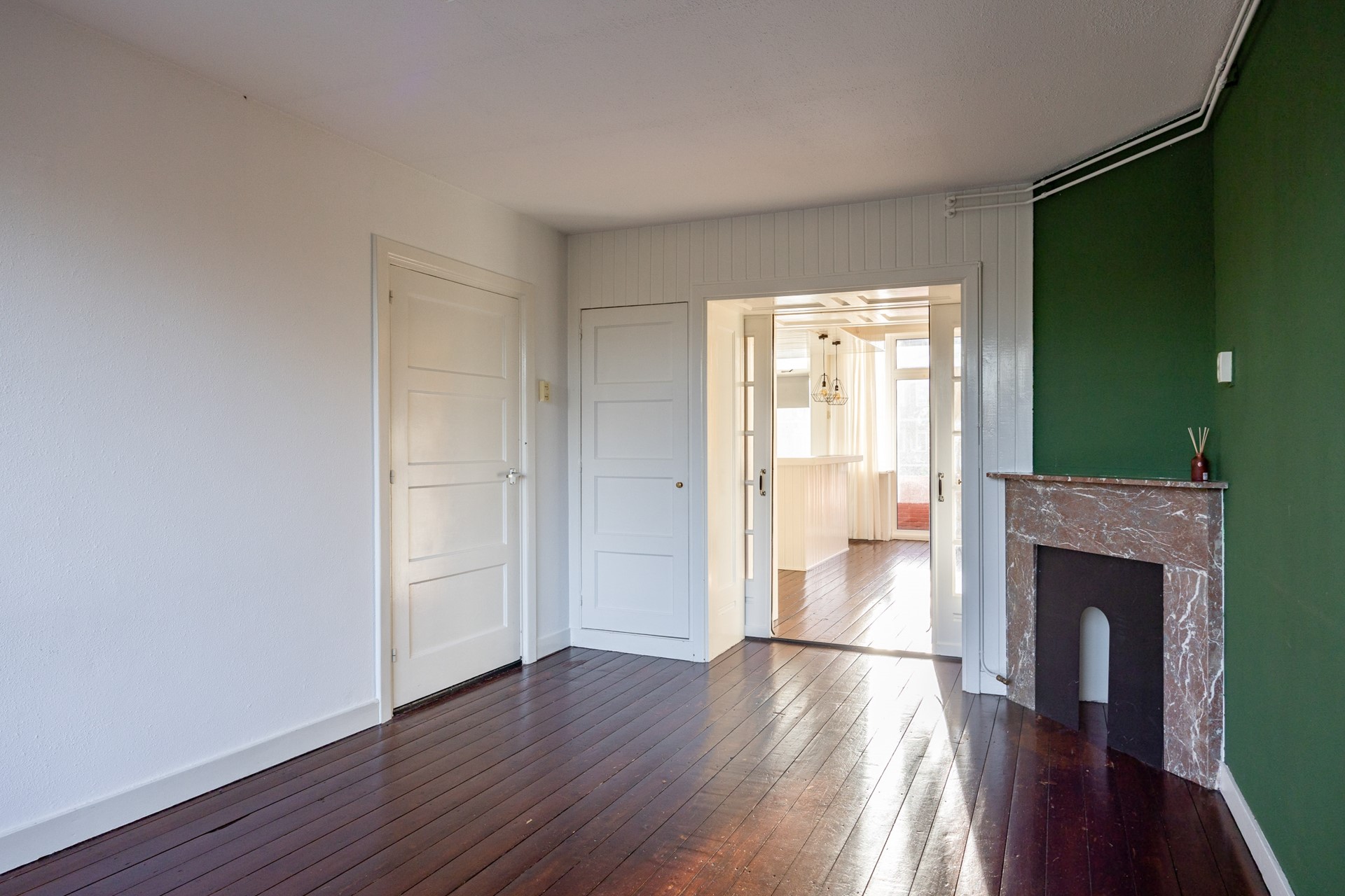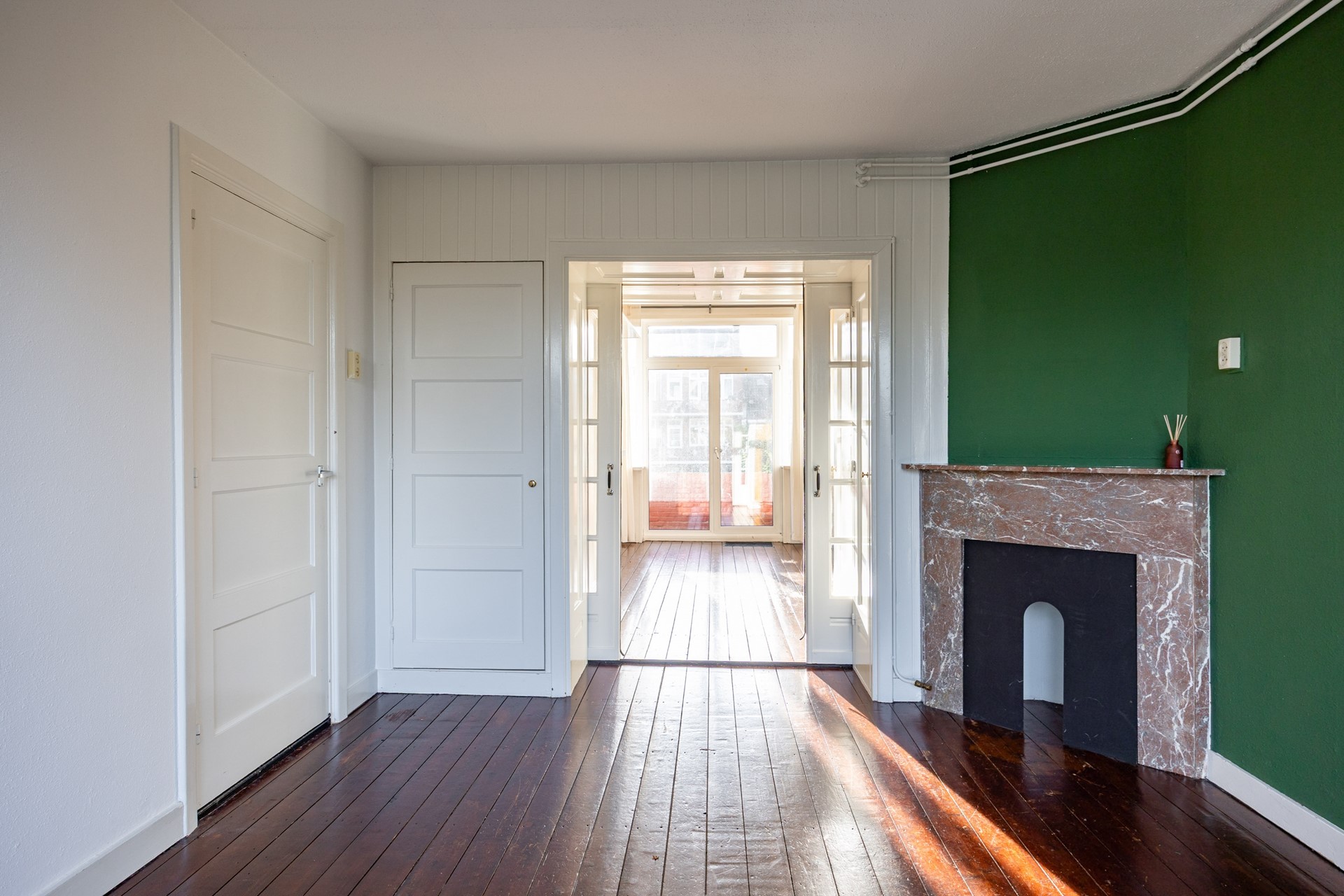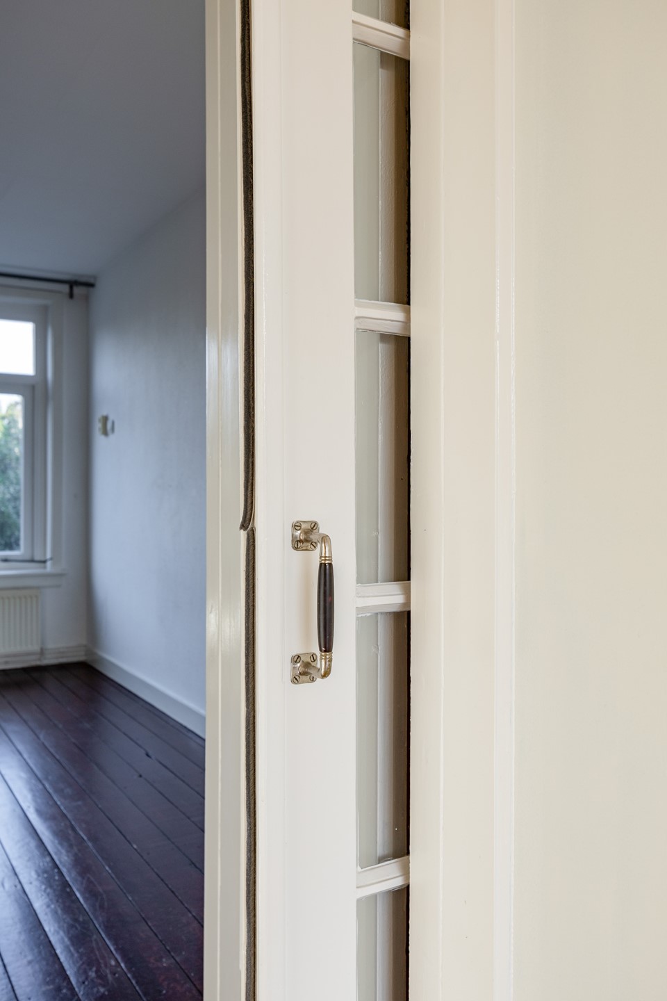 De slaapkamer ligt aan de straatzijde van de woning. De woonkamer en achterkamer zijn ruim bemeten en afsluitbaar via de originele kamer-en suite deuren. De authentieke schouwen zijn nog aanwezig. Dit zorgt voor extra sfeer in de ruimte samen met de houtenplanken vloeren.