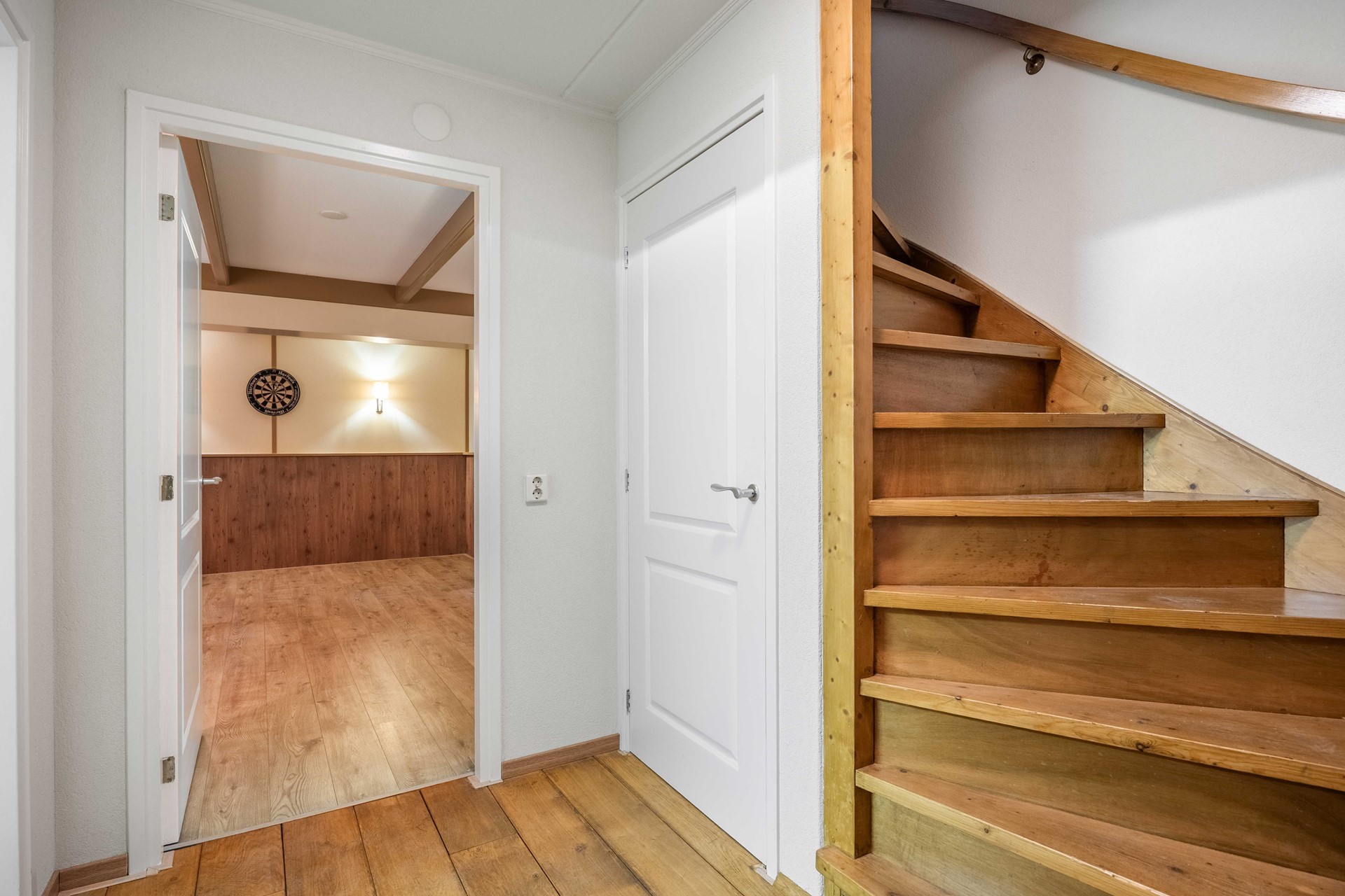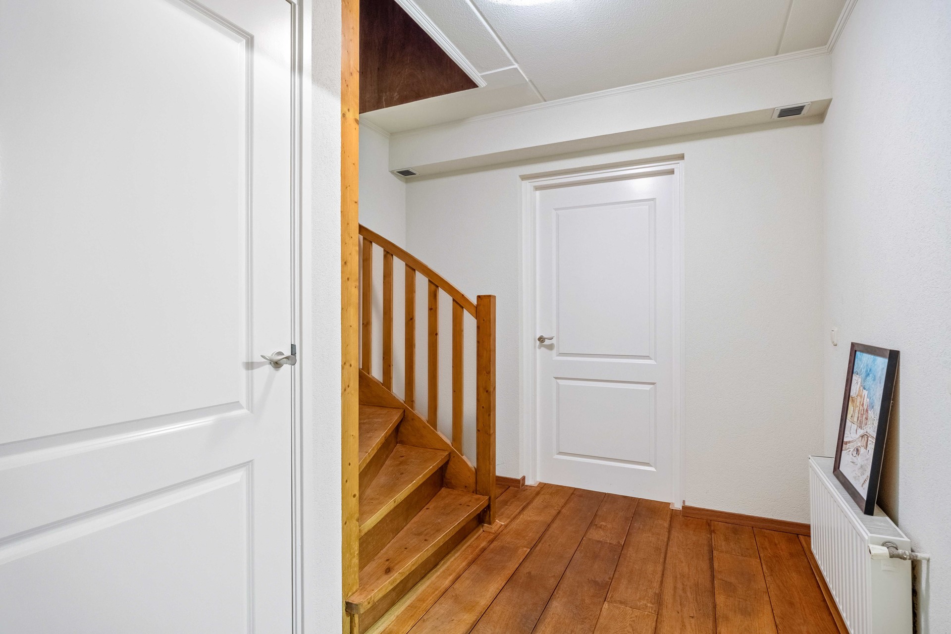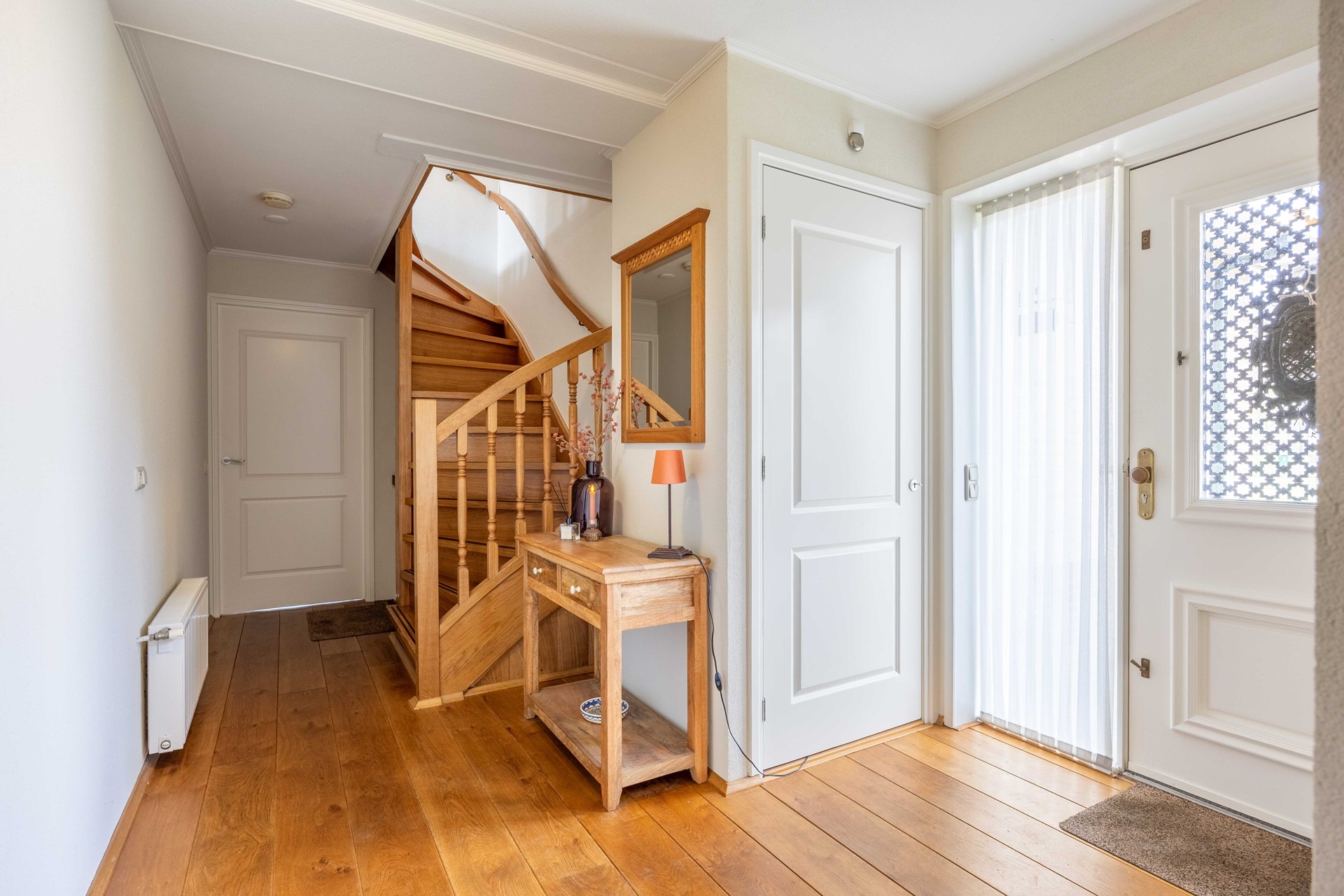 De begane grond ademt sfeer en kwaliteit, met een parketvloer, paneeldeuren en netjes afgewerkte wanden.