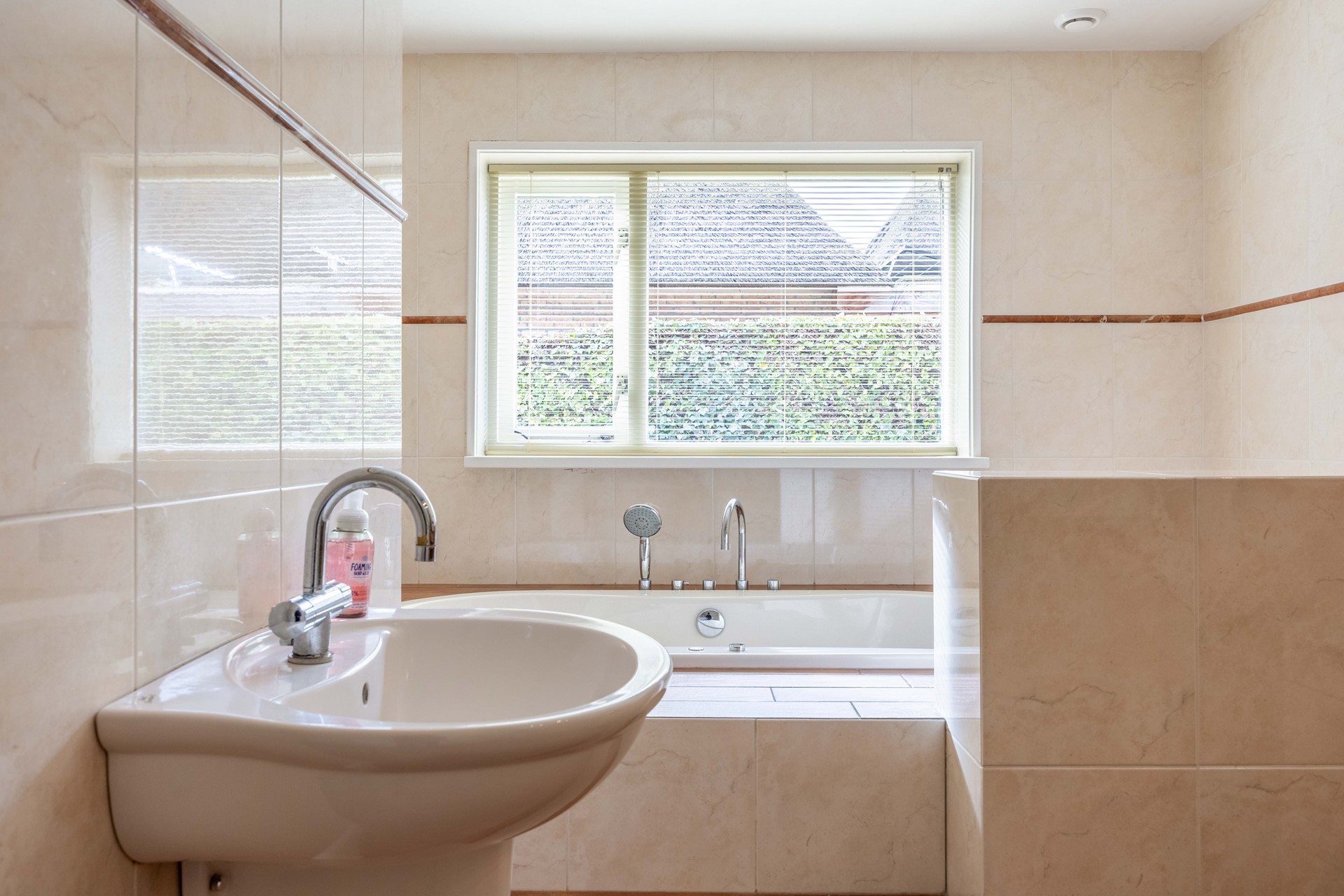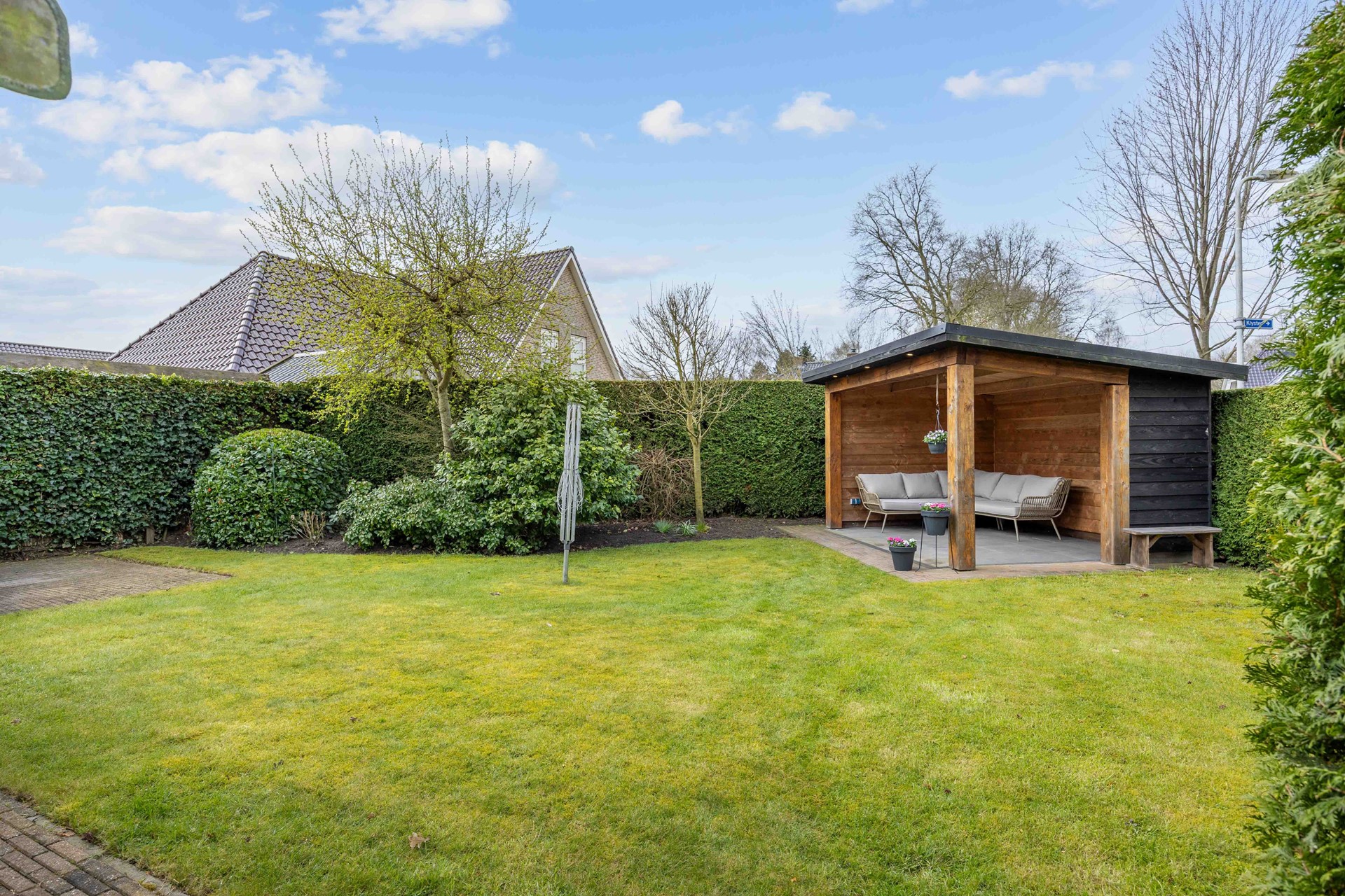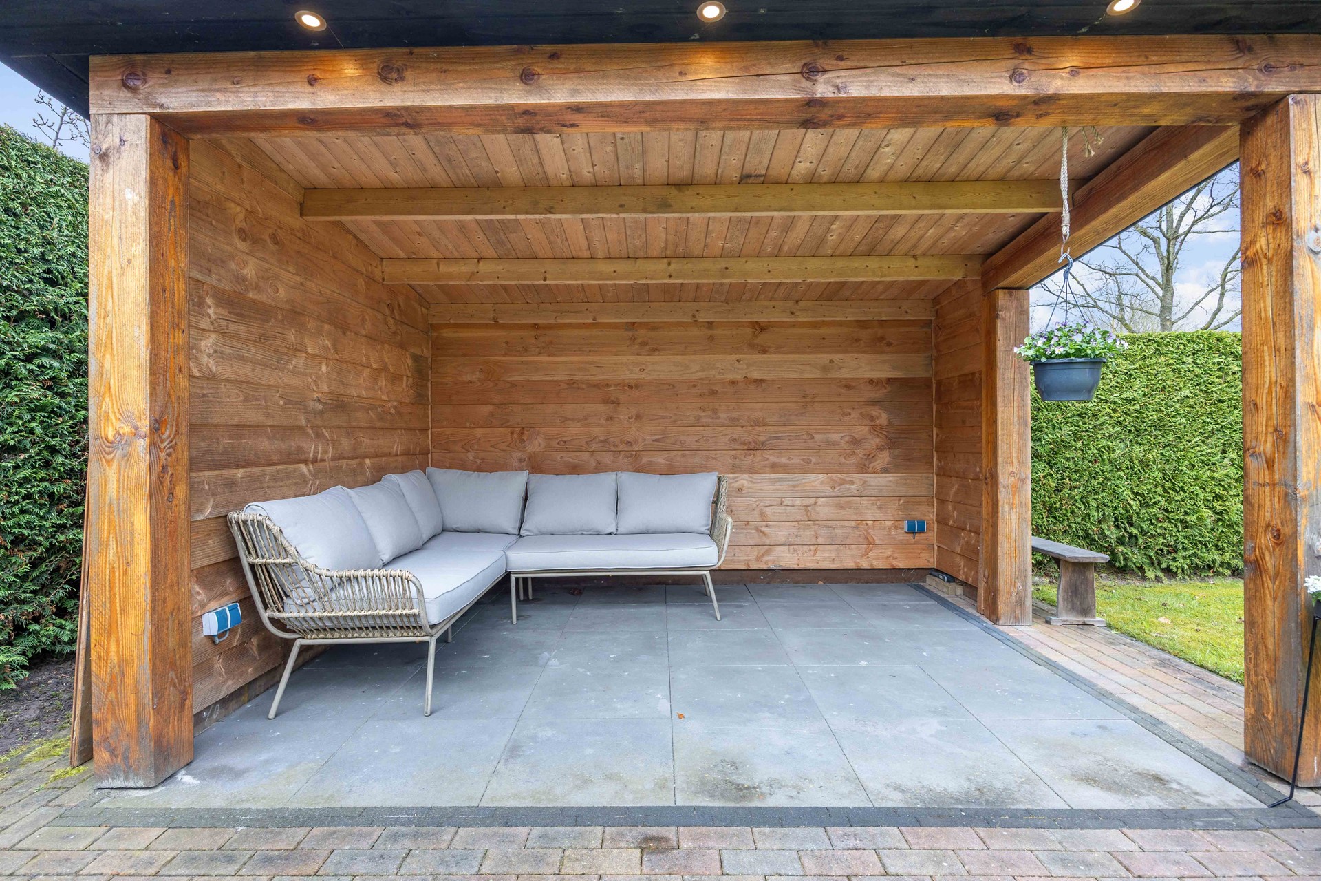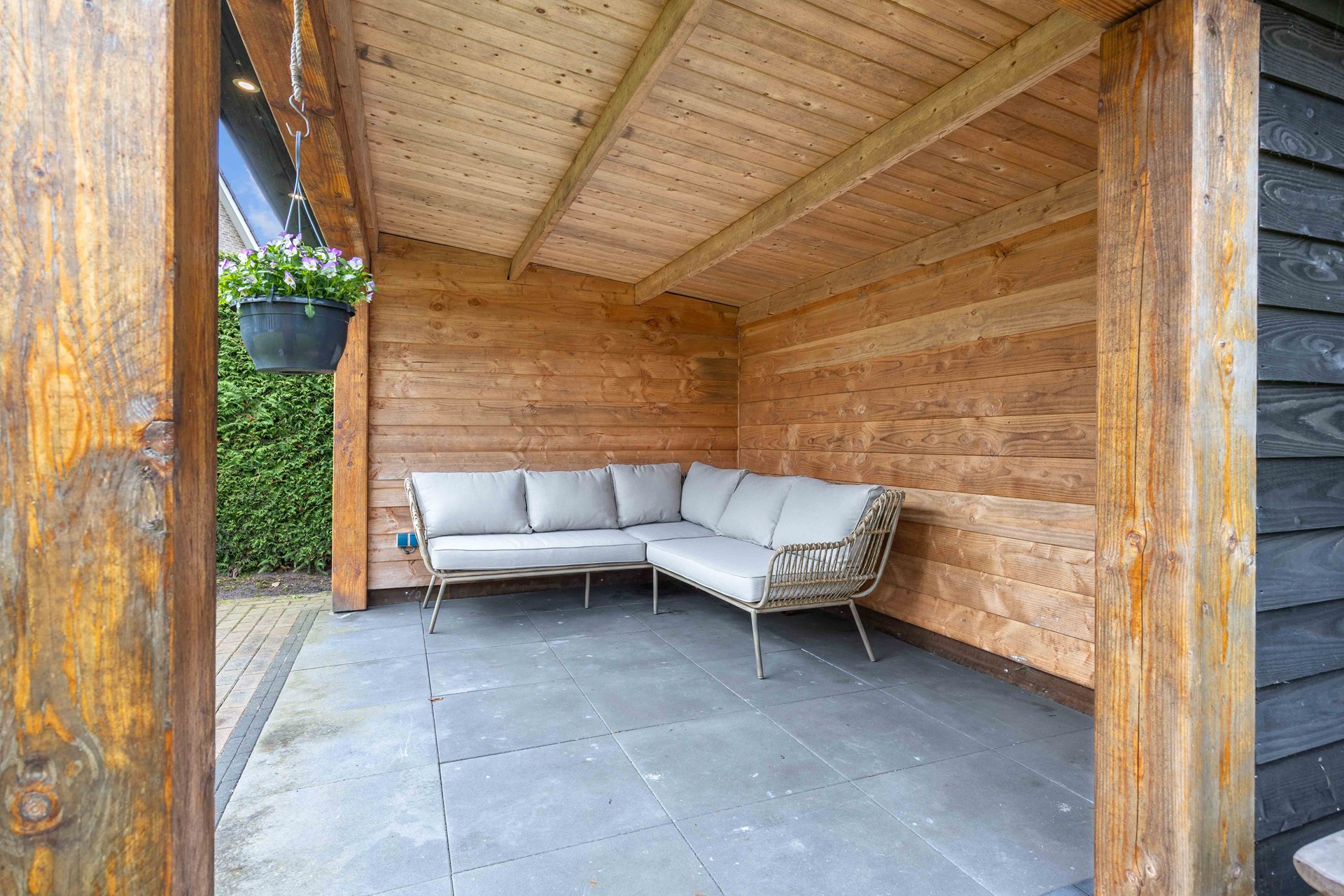 De tuin biedt volop privacy en is fraai aangelegd met een groene haag, gazon en borders met beplanting. Er zijn meerdere terrassen, waaronder een terras met overkapping van Douglas hout en een tweede terras met jacuzzi – een heerlijke plek om te ontspannen.