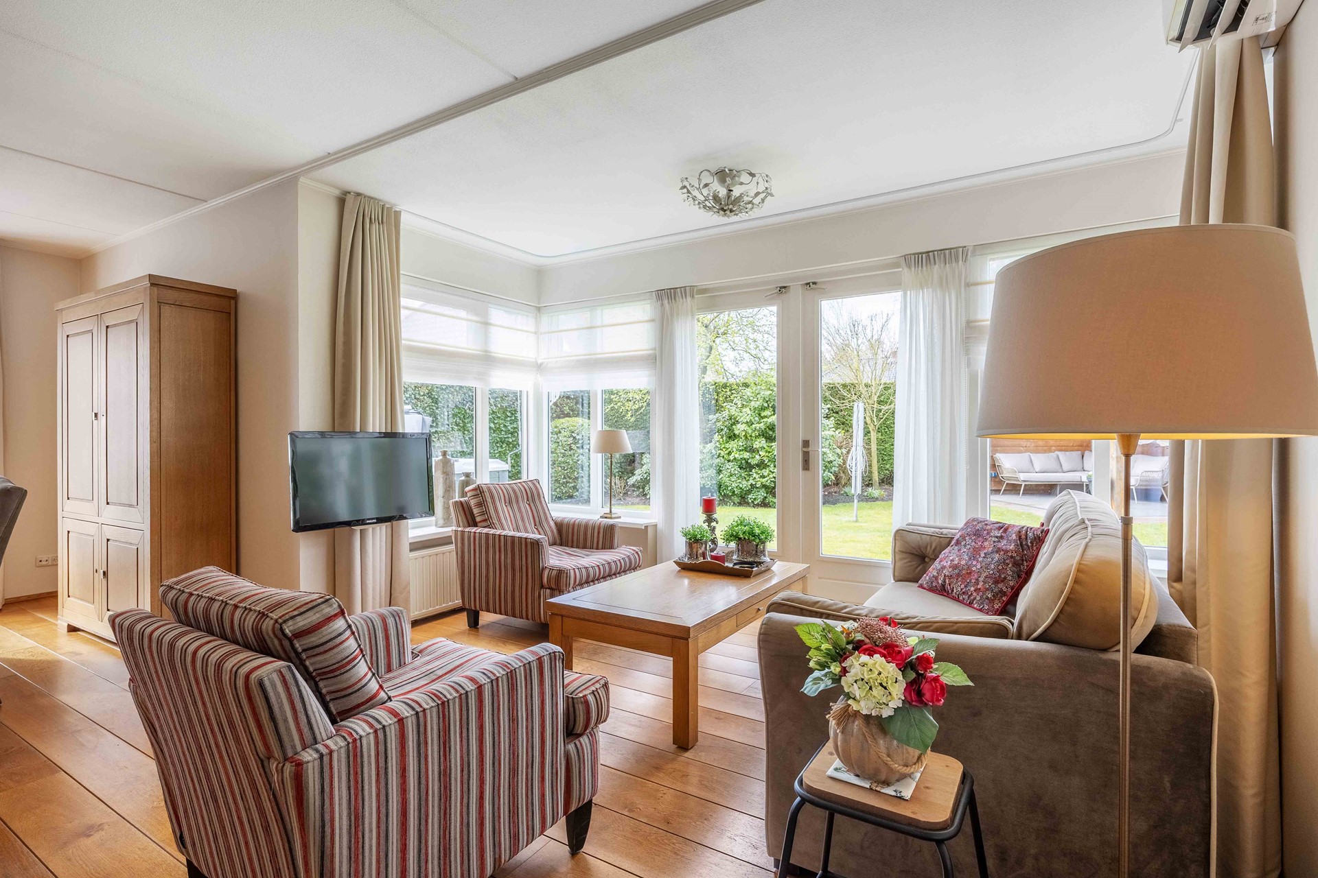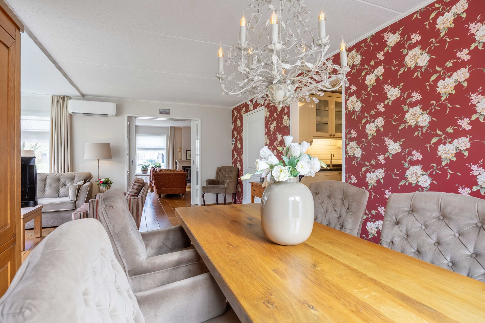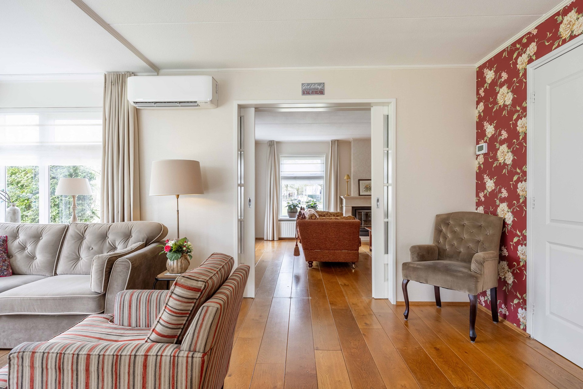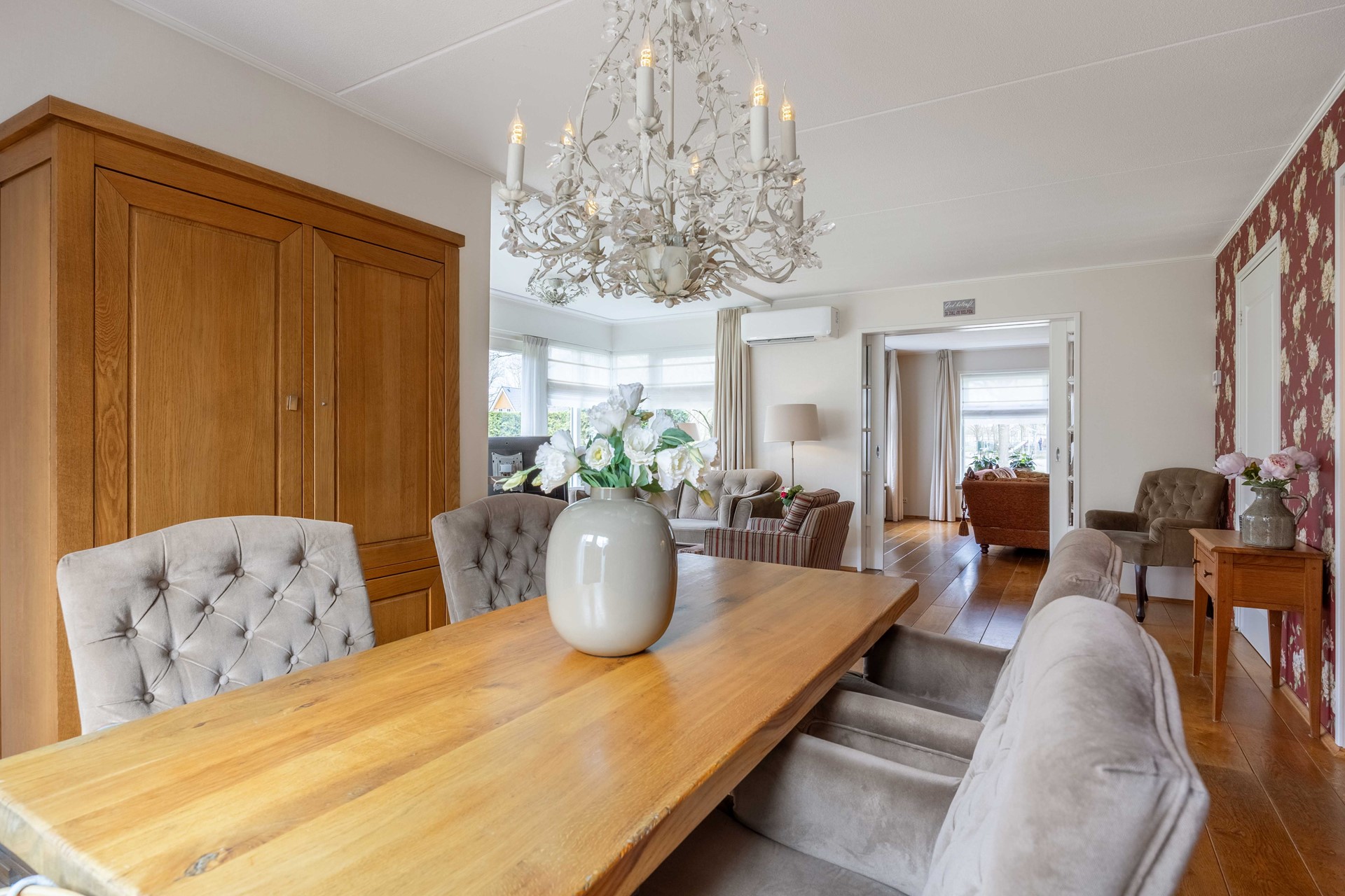 De royale, tuingerichte woonkamer met dubbele tuindeuren en aangebouwde serre zorgt voor veel licht en een fijne verbinding met de tuin. Daarnaast beschikt de woning over een tweede woonkamer van circa 27 m² met een sfeervolle open haard.
