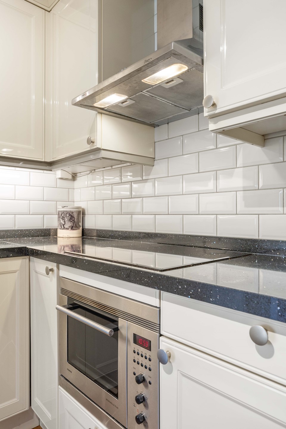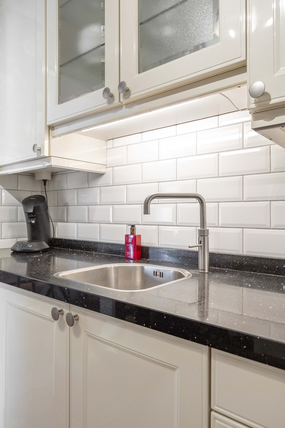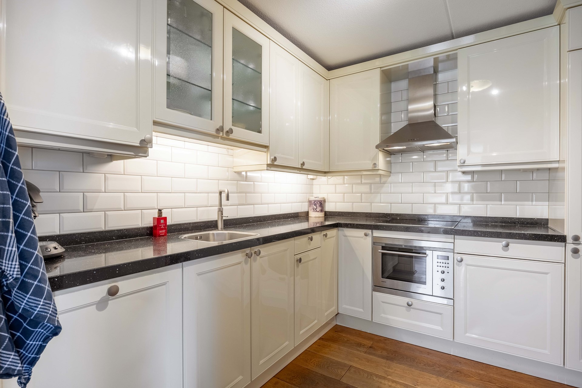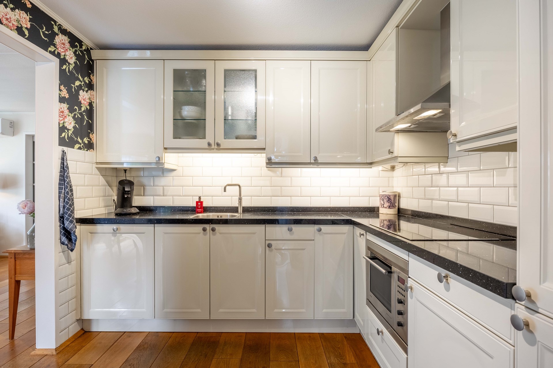De keuken is compleet uitgerust met diverse inbouwapparatuur, waaronder een koelkast, vriezer, vaatwasser, combimagnetron, inductiekookplaat, Quooker en afzuigkap. Aansluitend vindt u de bijkeuken met witgoedaansluitingen en de cv-opstelling.