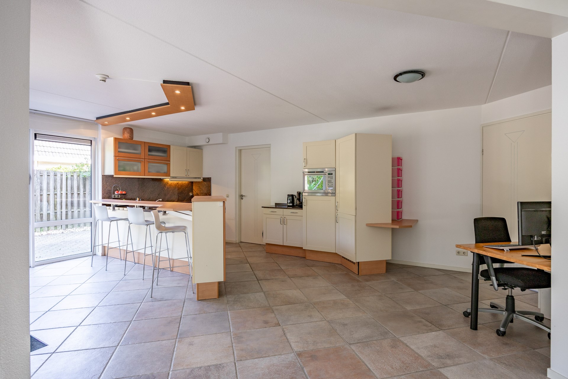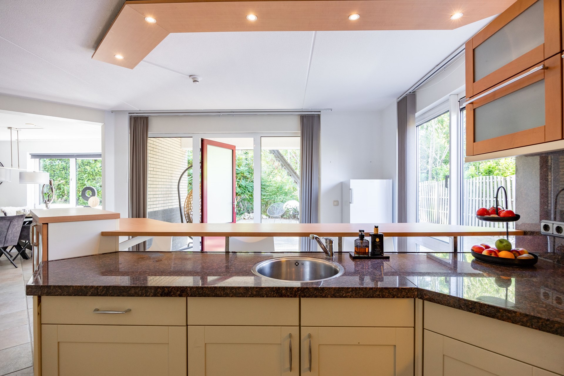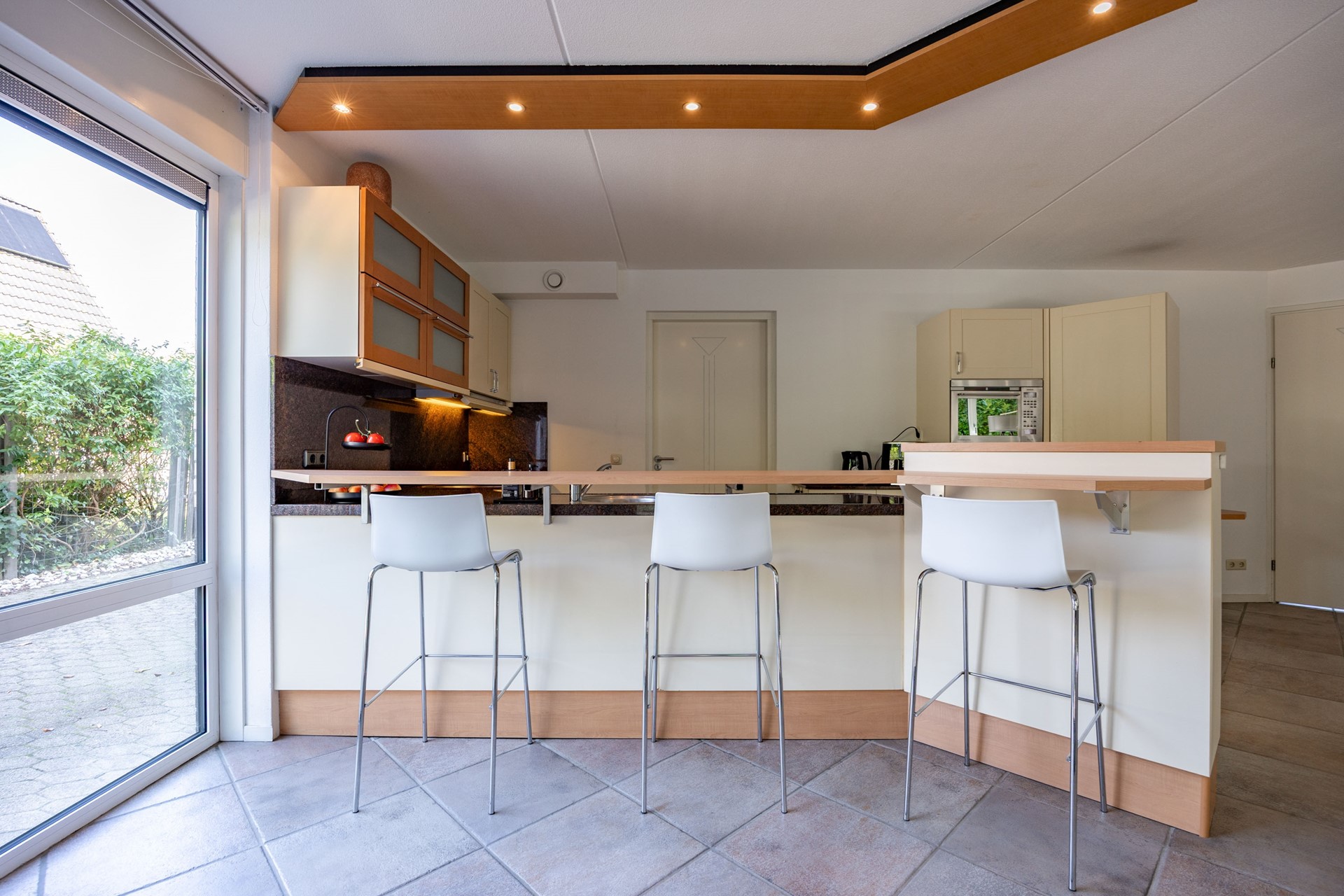 Binnen wacht u een verrassend speelse ingedeelde woning. De woonkamer is licht, comfortabel en voorzien van vloerverwarming en openslaande deuren naar de rondom gelegen tuin. Een sfeervolle haardpartij is aanwezig, en kan met een kleine aanpassing, weer in gebruik worden genomen. De woonkamer loopt over in de open keuken, die ook een toegangsdeur heeft naar de tuin. Vanuit de keuken komt u in de royale inpandige garage terecht. De garage is ruim en uitgerust met elektrische garagedeuren, ideaal voor opslag, hobby’s of eventueel een werkplek aan huis.