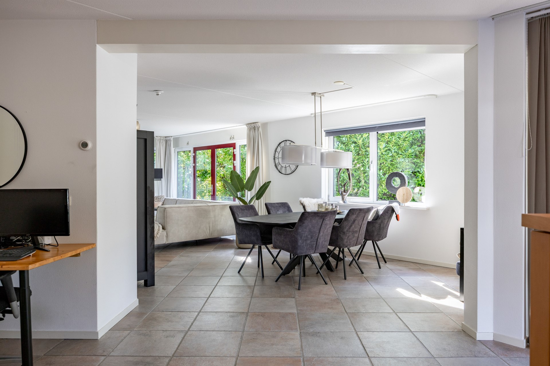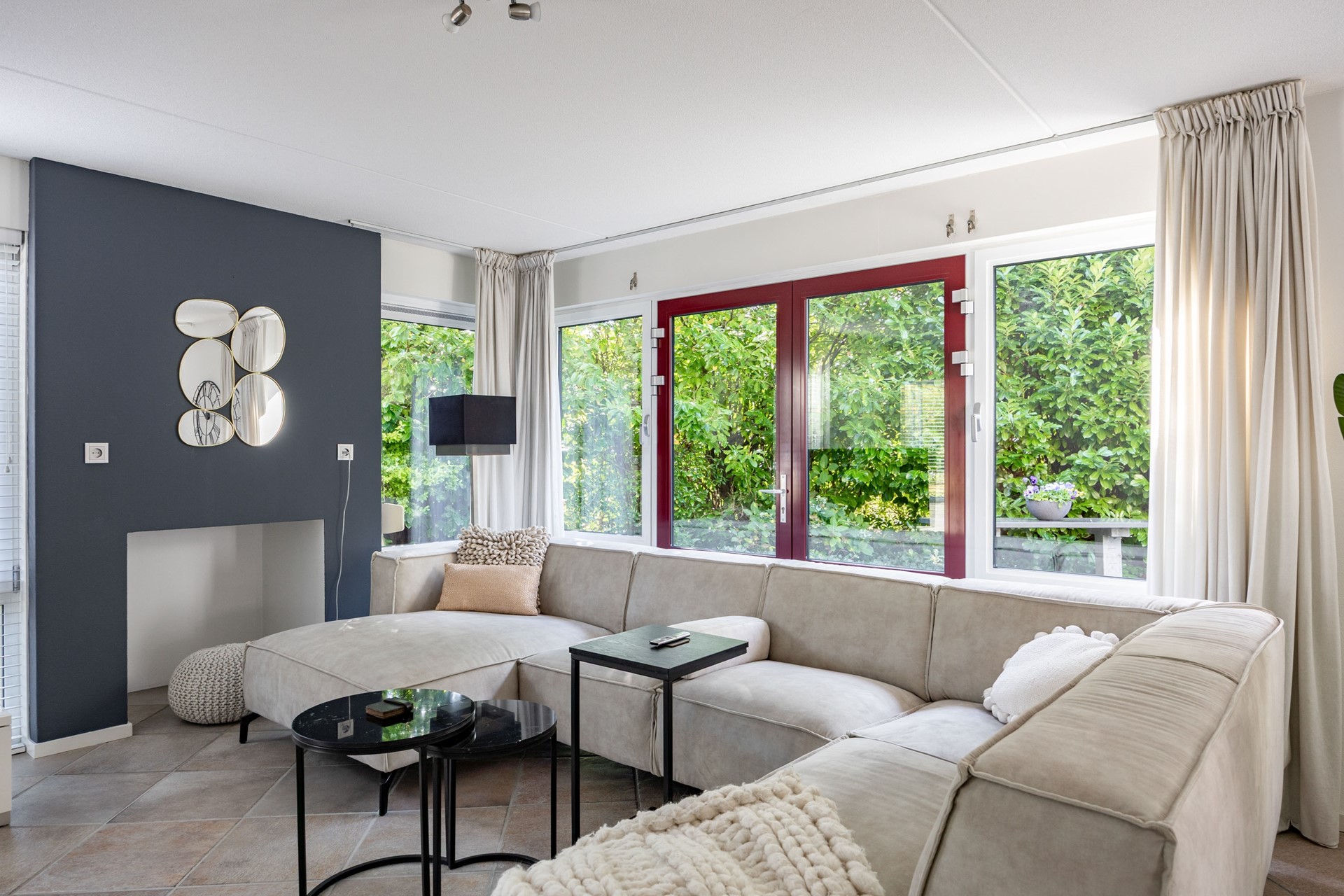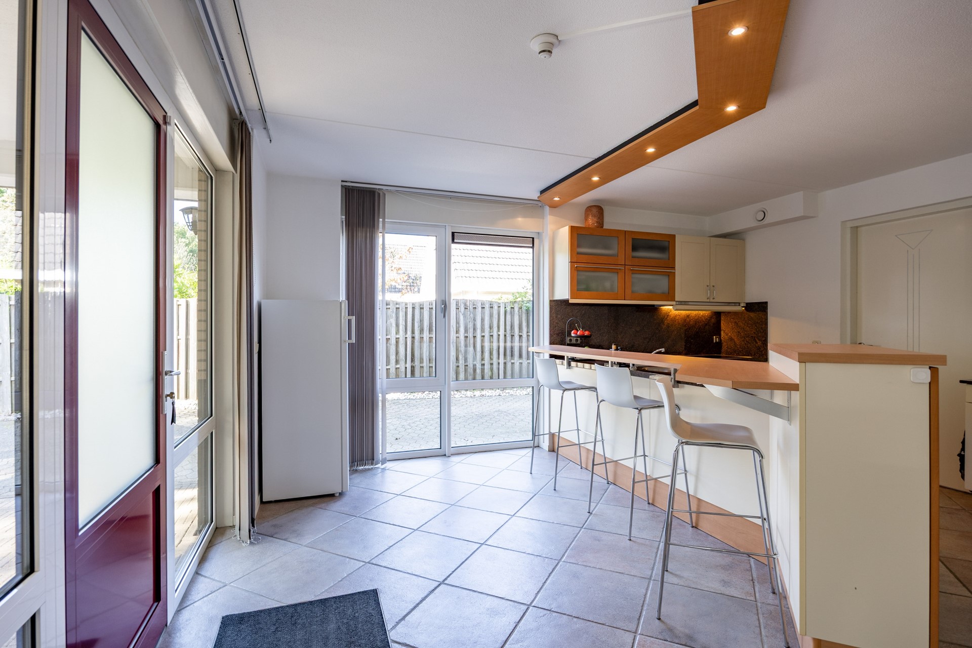 Binnen wacht u een verrassend speelse ingedeelde woning. De woonkamer is licht, comfortabel en voorzien van vloerverwarming en openslaande deuren naar de rondom gelegen tuin. Een sfeervolle haardpartij is aanwezig, en kan met een kleine aanpassing, weer in gebruik worden genomen. De woonkamer loopt over in de open keuken, die ook een toegangsdeur heeft naar de tuin. Vanuit de keuken komt u in de royale inpandige garage terecht. De garage is ruim en uitgerust met elektrische garagedeuren, ideaal voor opslag, hobby’s of eventueel een werkplek aan huis.