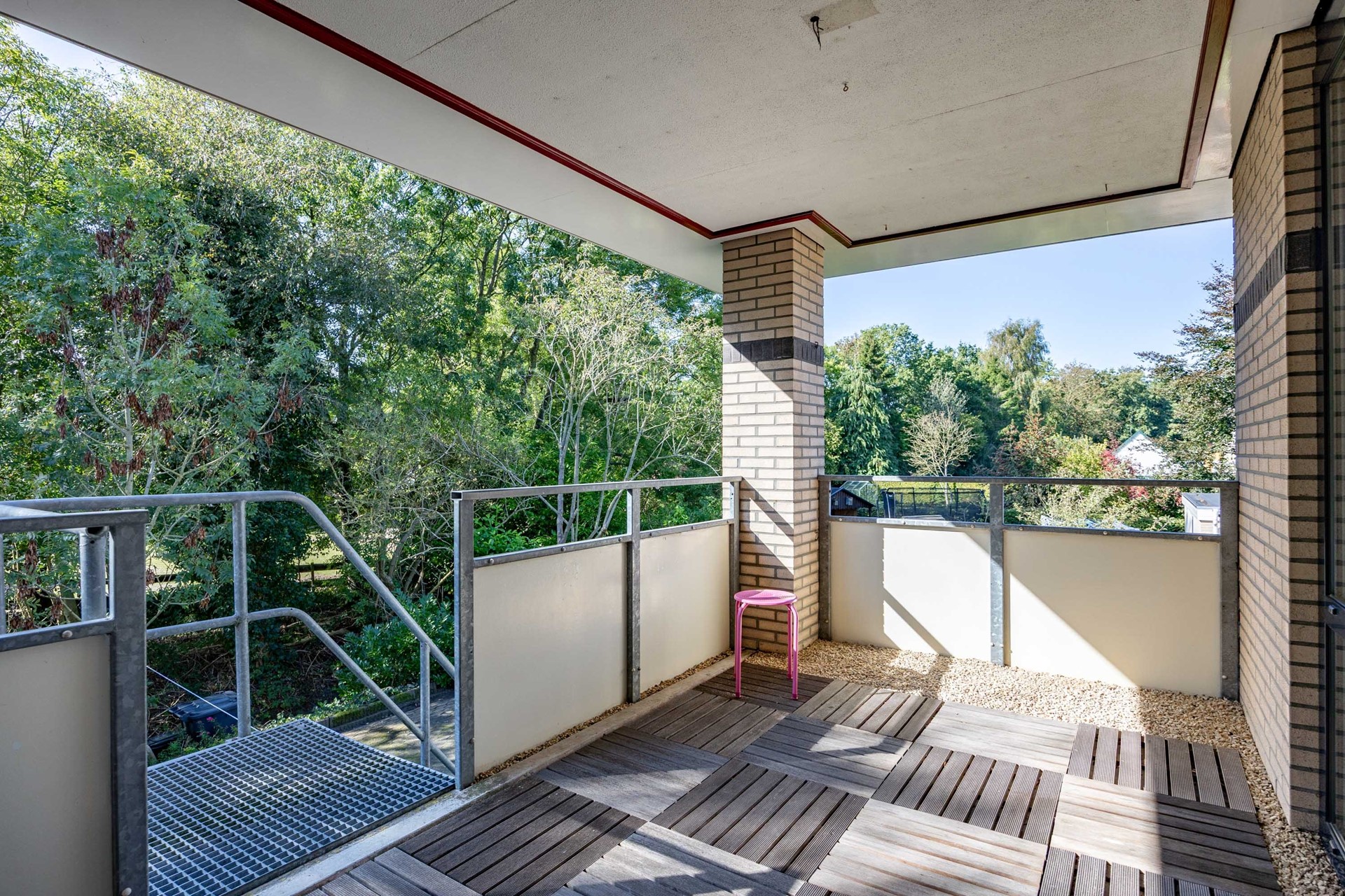 De eerste verdieping is bereikbaar via een buitentrap aan de achterzijde van de woning, die uitkomt op een balkon. De originele trap naar boven bevond zich beneden in de voorhal, maar is destijds verwijderd om ruimte te maken voor dubbele familie bewoning. Dit geeft de mogelijkheid voor bijvoorbeeld mantelzorg of zelfstandig inwonende kinderen. Indien gewenst kan door een klein herstel dit teruggedraaid worden naar de oorspronkelijke situatie.