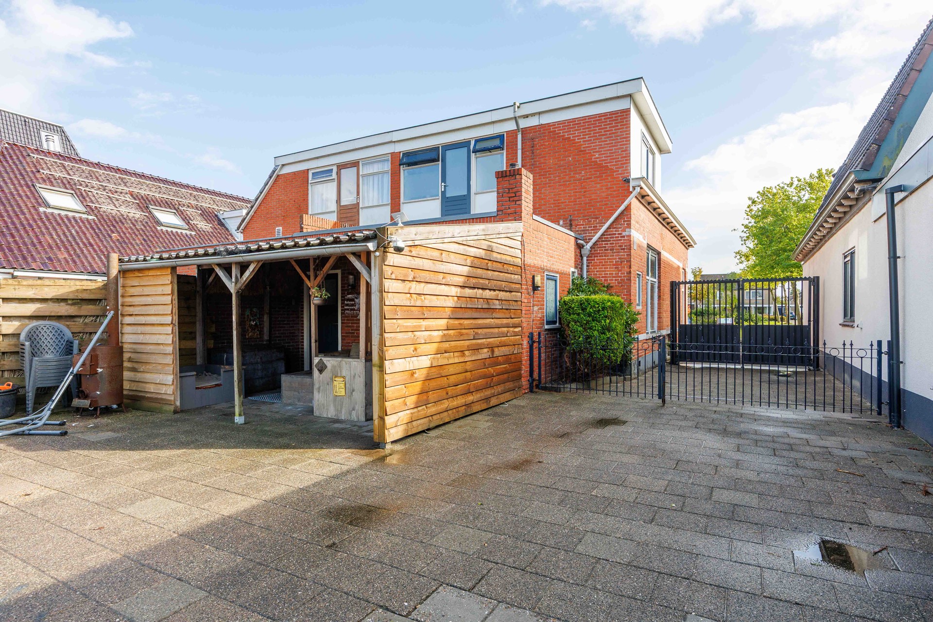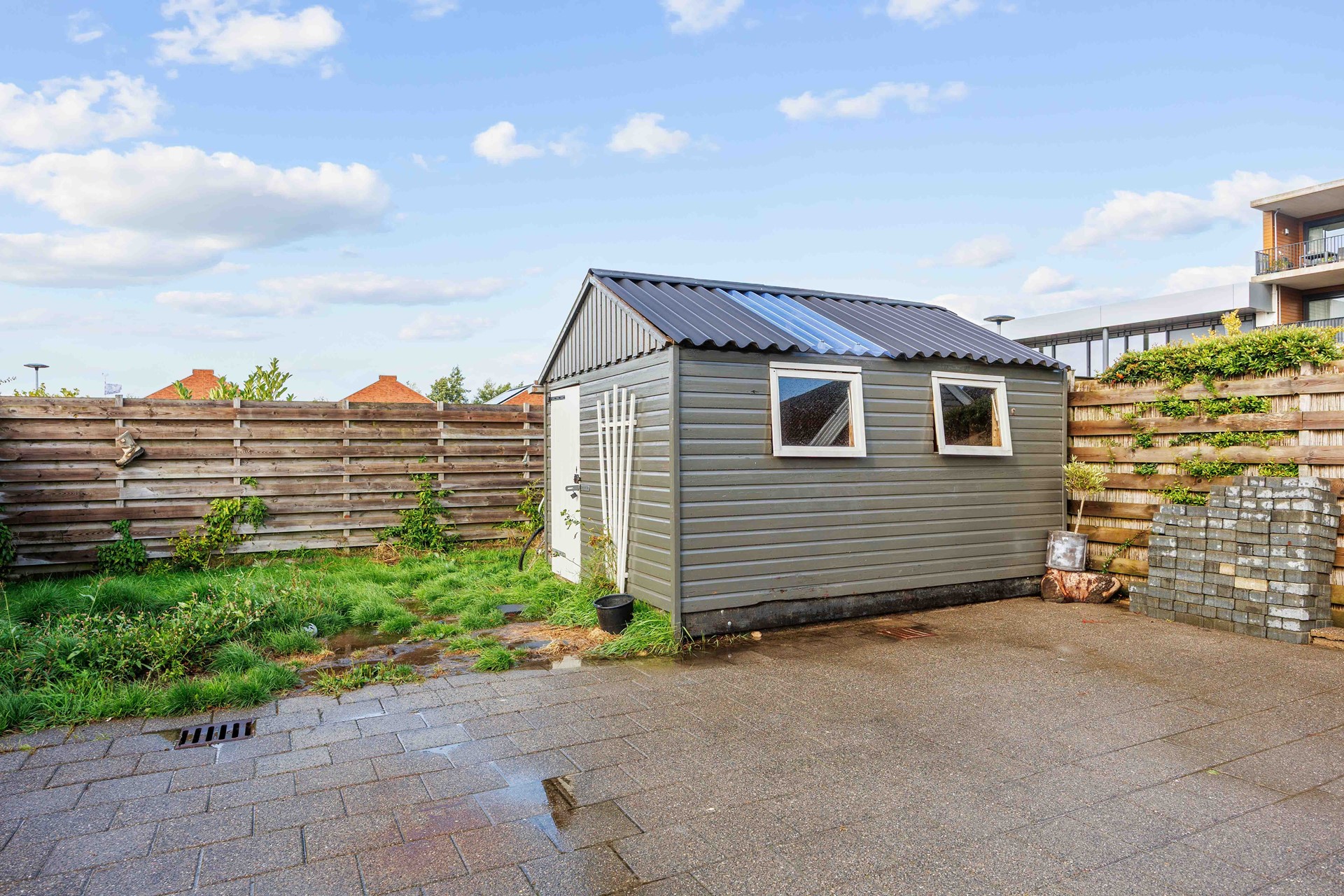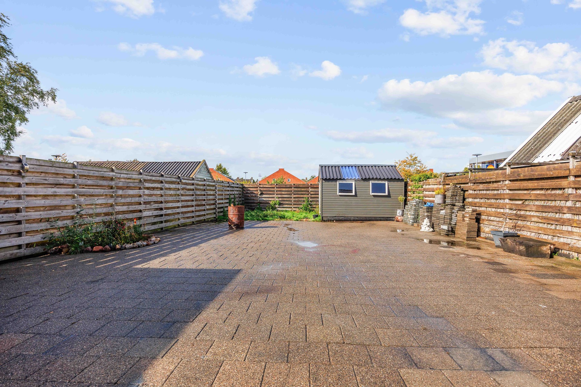 Achter de woning ligt een diepe tuin waar u volop kunt genieten van de buitenlucht. De tuin heeft niet alleen veel ruimte, maar is ook voorzien van een schuur ideaal voor tuingereedschap of het stallen van fietsen. De oprit aan de zijkant van de woning zorgt voor parkeergelegenheid op eigen terrein en doorgang naar de achtertuin.