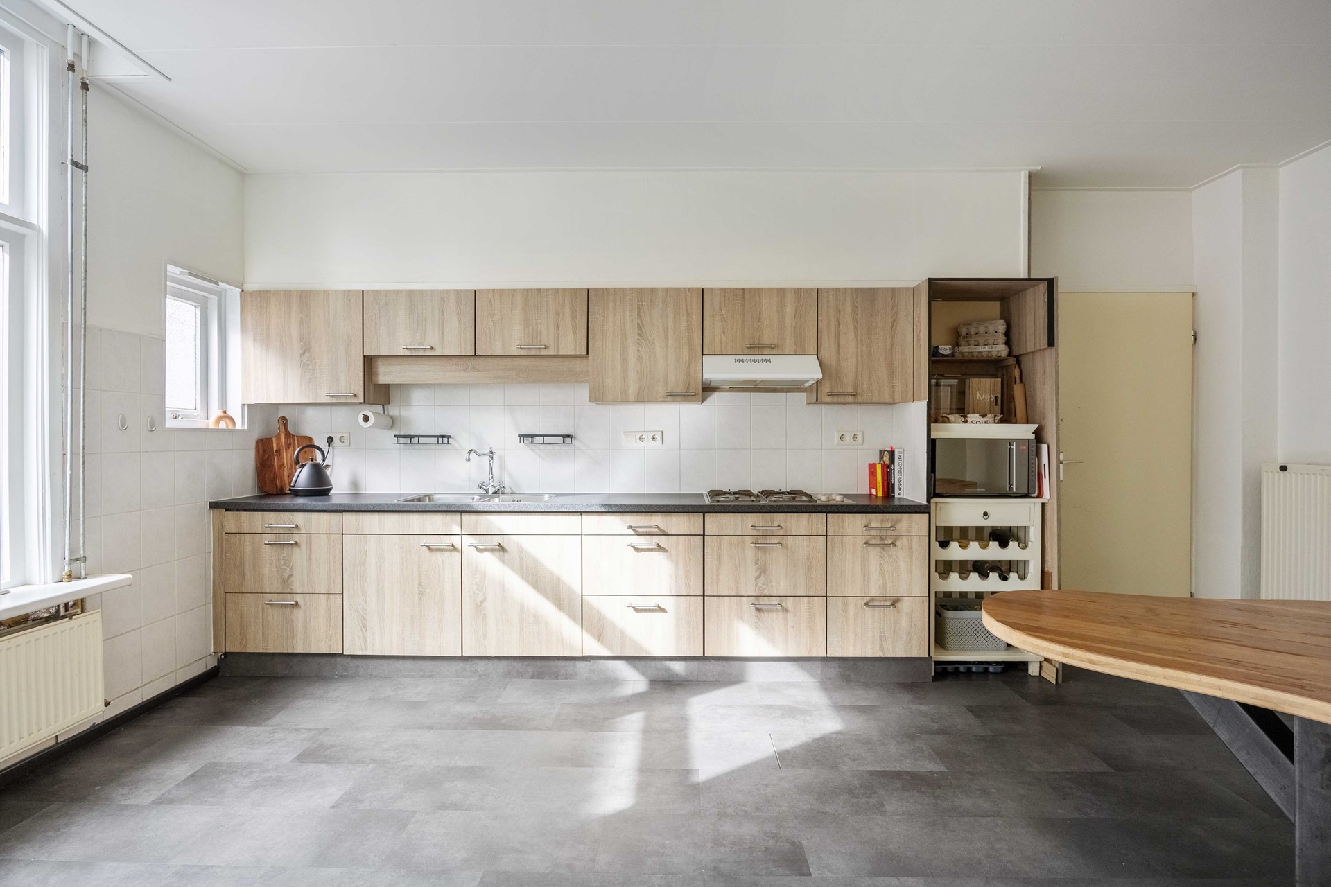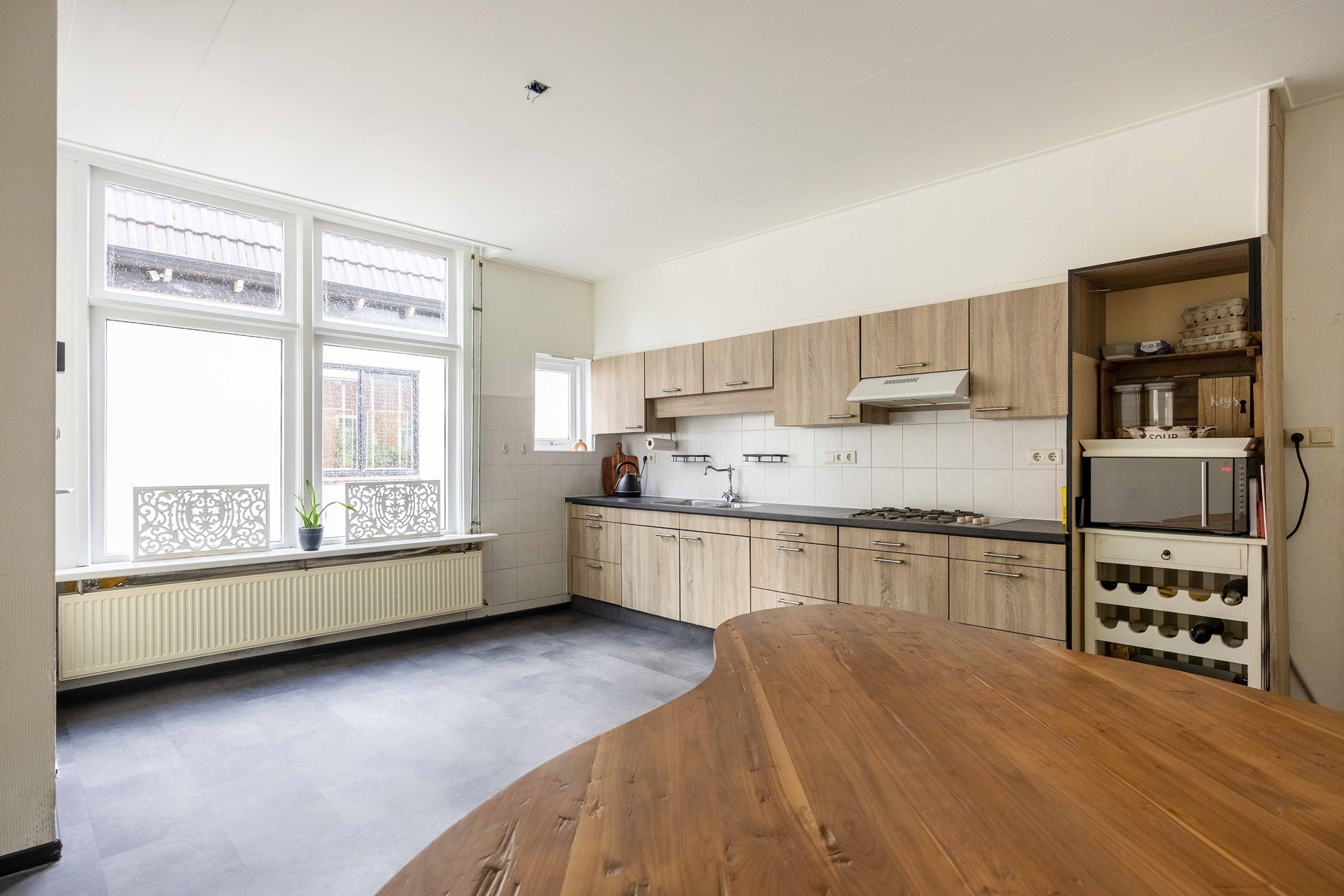 Aan de voorzijde van de woning vindt u de entree. In de hal zit de meterkast, toegang tot de woonkamer aan de straatzijde. De begane grond heeft een fijne indeling met een royale eetkeuken, waar je heerlijk kunt genieten van een ruim opgezette keuken. Deze eetkamer biedt ruimte voor een grote eettafel en staat in verbinding middels een deur met de woonkamer, ideaal om de ruimtes van elkaar af te sluiten. Vanuit de keuken/eetkamer komt u in de bijkeuken. De handige bijkeuken met toilet en witgoedaansluiting maakt het dagelijks huishouden eenvoudig en praktisch. De kelder in deze woning geeft extra gemakken voor het opbergen van uw spullen.